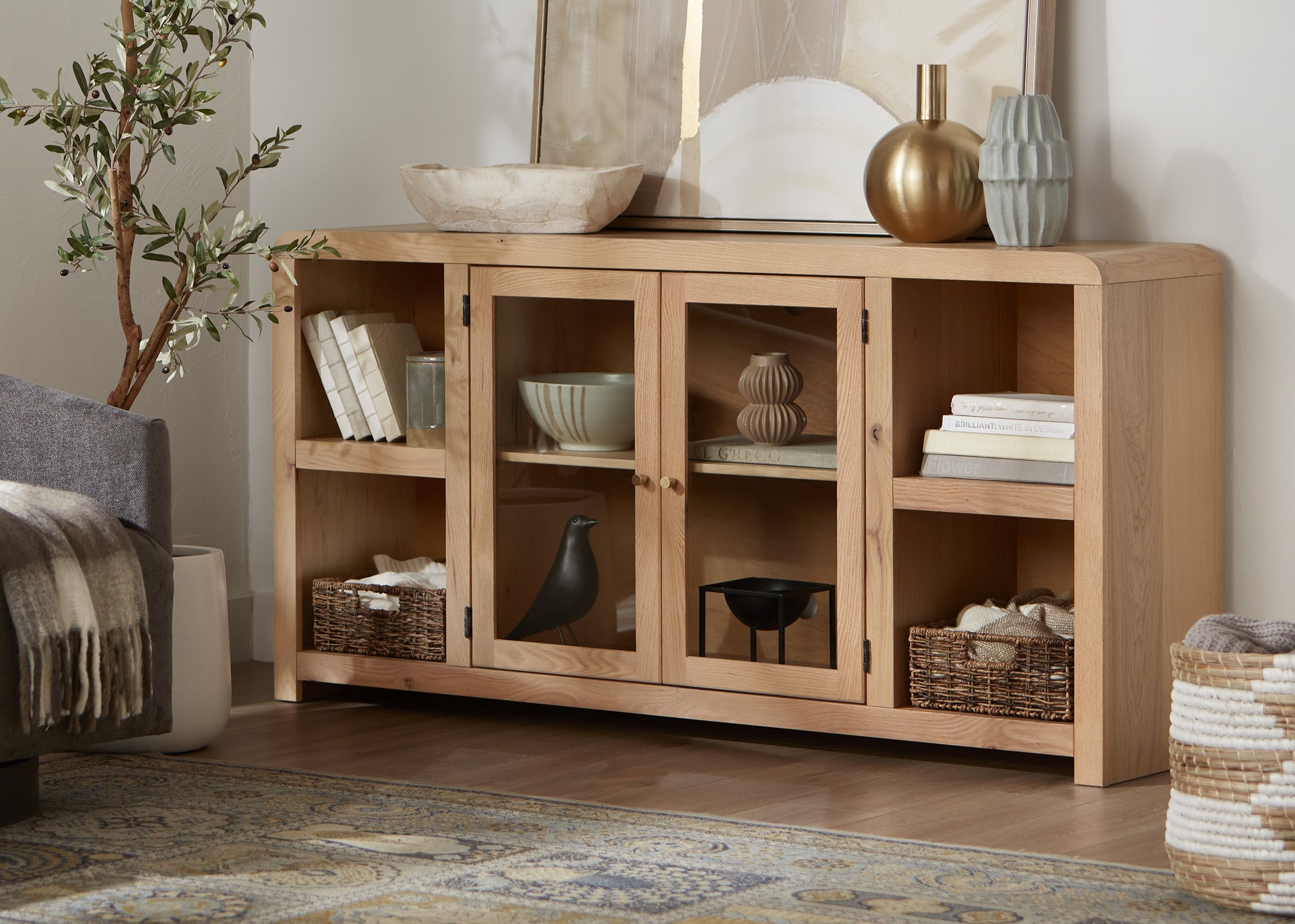 Elevate your entertainment space with this gorgeous console. Curved edges add a touch of mid-century charm while the simplistic silhouette and mini champagne knobs bring this piece into the modern age. The center glass doors add an airy aesthetic to your living room while the wire management system allows cords to stay hidden. Display all your favorite living room décor or store entertainment necessities such as movies or games in the convenient side cubby units. Whatever your needs for your entertainment space, this console is the perfect solution!