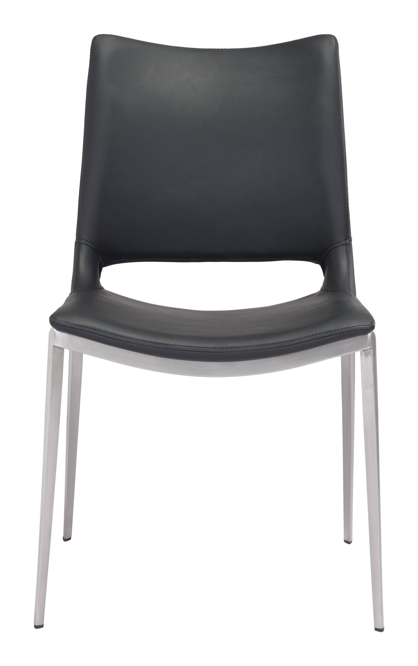 This sleek armless dining chair lets you sit back and relax in comfort. Its perfectly pitched back cradles you, while the sturdy steel frame supports your every move. The black faux leather seat is beautifully stitched adding a designer detail to a simple profile. Protective plastic feet will keep your floors from scratching. Gorgeous around your table, or pulled up to the desk in your home office.