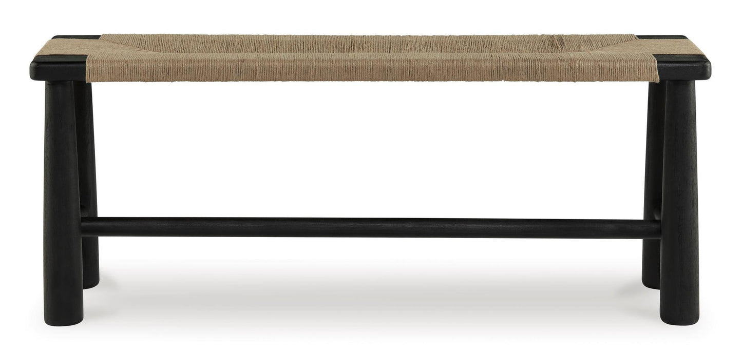 Understated style done beautifully well. The black wood frame and tapered post legs of this accent bench are a striking contrast with its handwoven natural jute upholstery. Combining a contemporary aesthetic with a mid-century vibe, it's ideal for a living room, an entryway or as the perfect seat beneath a window.