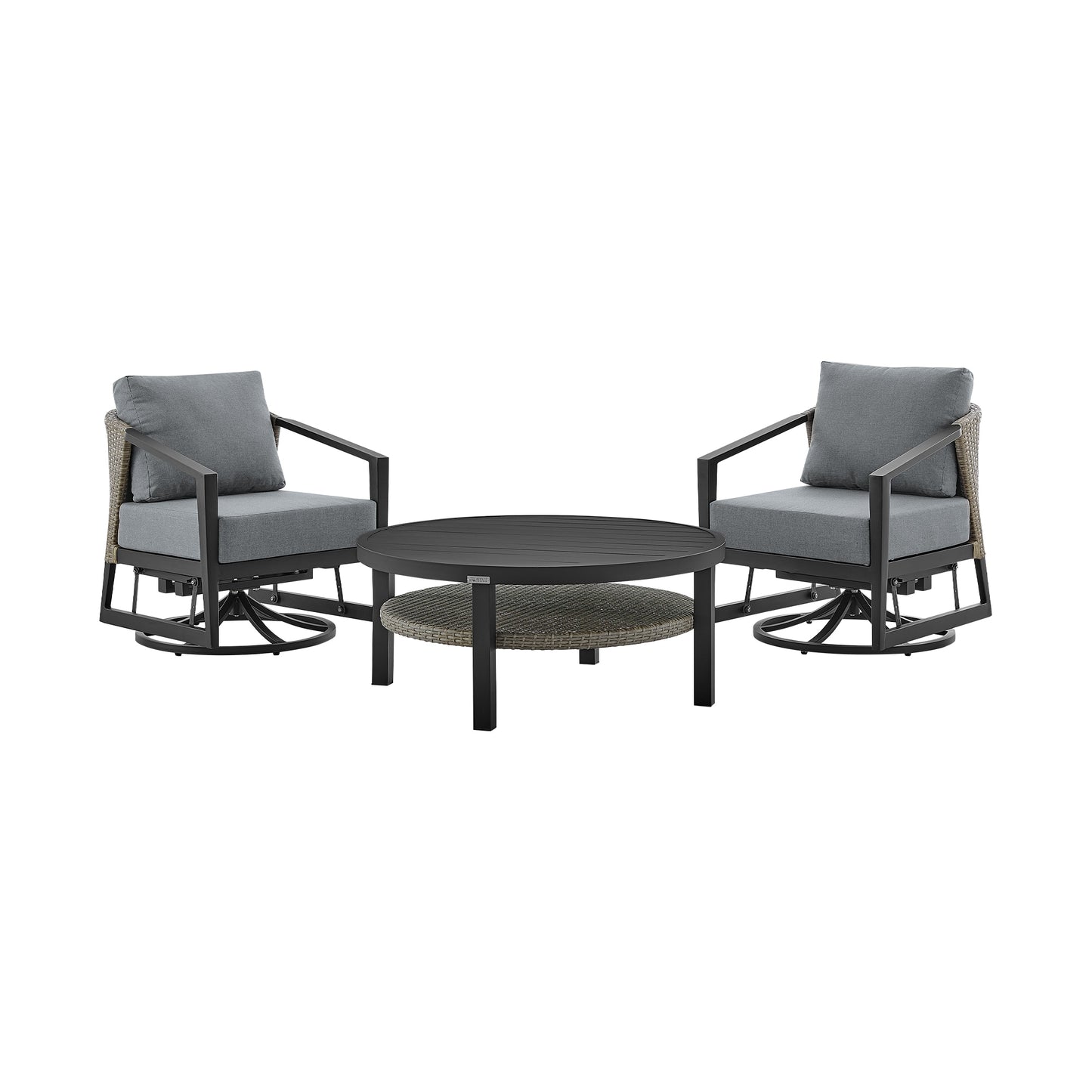 Aileen 3 Piece Patio Outdoor Swivel Seating Set in Black Aluminum with Gray Wicker and Cushions