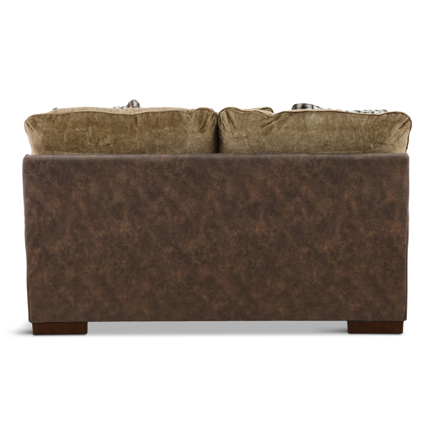 Punctuated by a subtle band of nailhead trim, this loveseat is perfect for those who love the look of leather. Two textural tones provide twice the style and comfort—and incorporate an added layer of visual interest. Throw pillows add a fun decorative element.