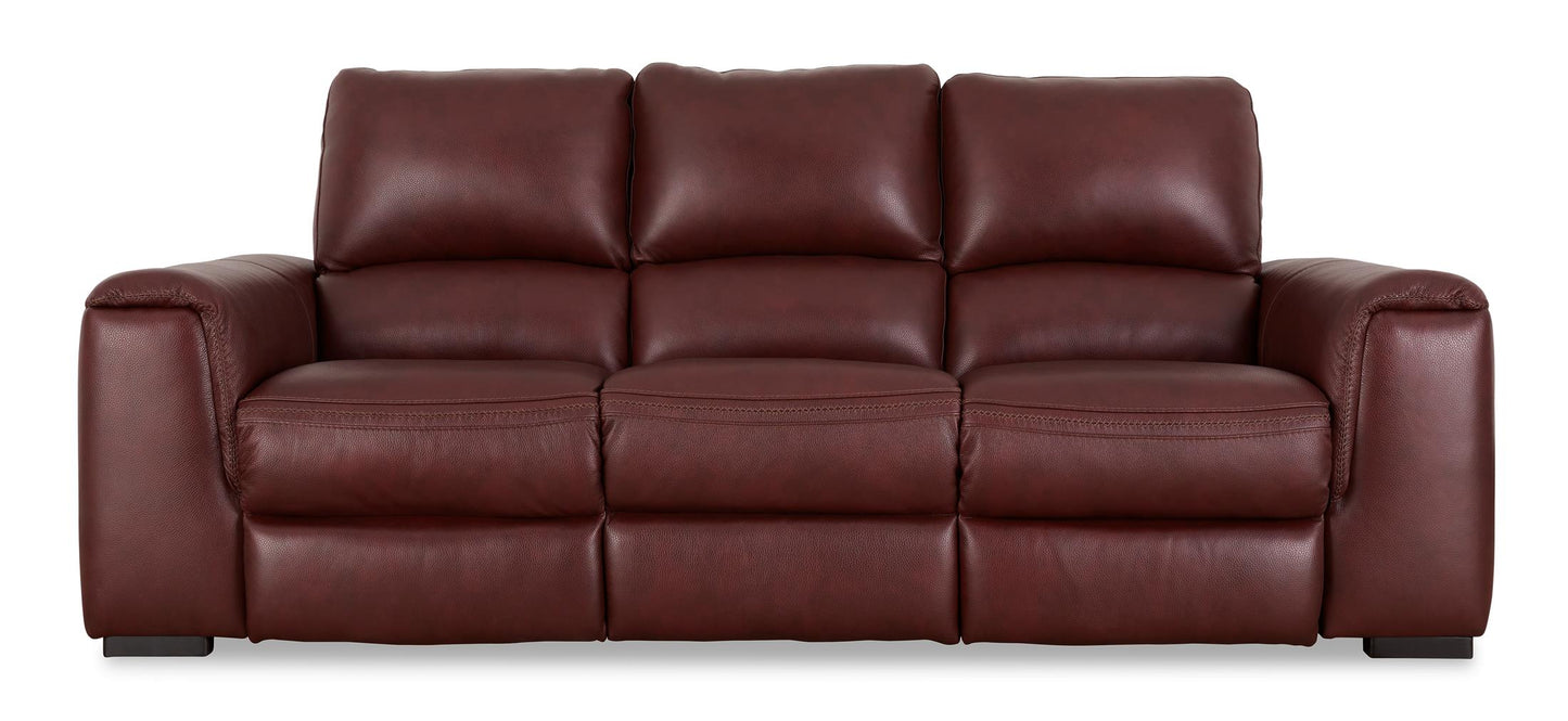 Impressive in scale while keeping an air of refinement, this power reclining sofa stuns with soft, supple leather match upholstery in garnet. Sink into the seating area and cater to your comfort with one-touch power reclining and an adjustable headrest. Complete with USB charging, this sofa makes a surefire statement in your contemporary living room.