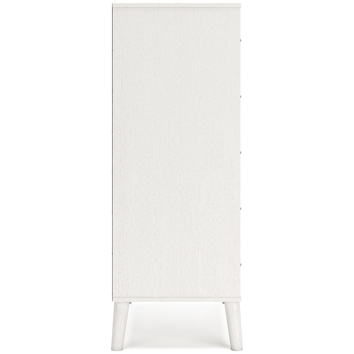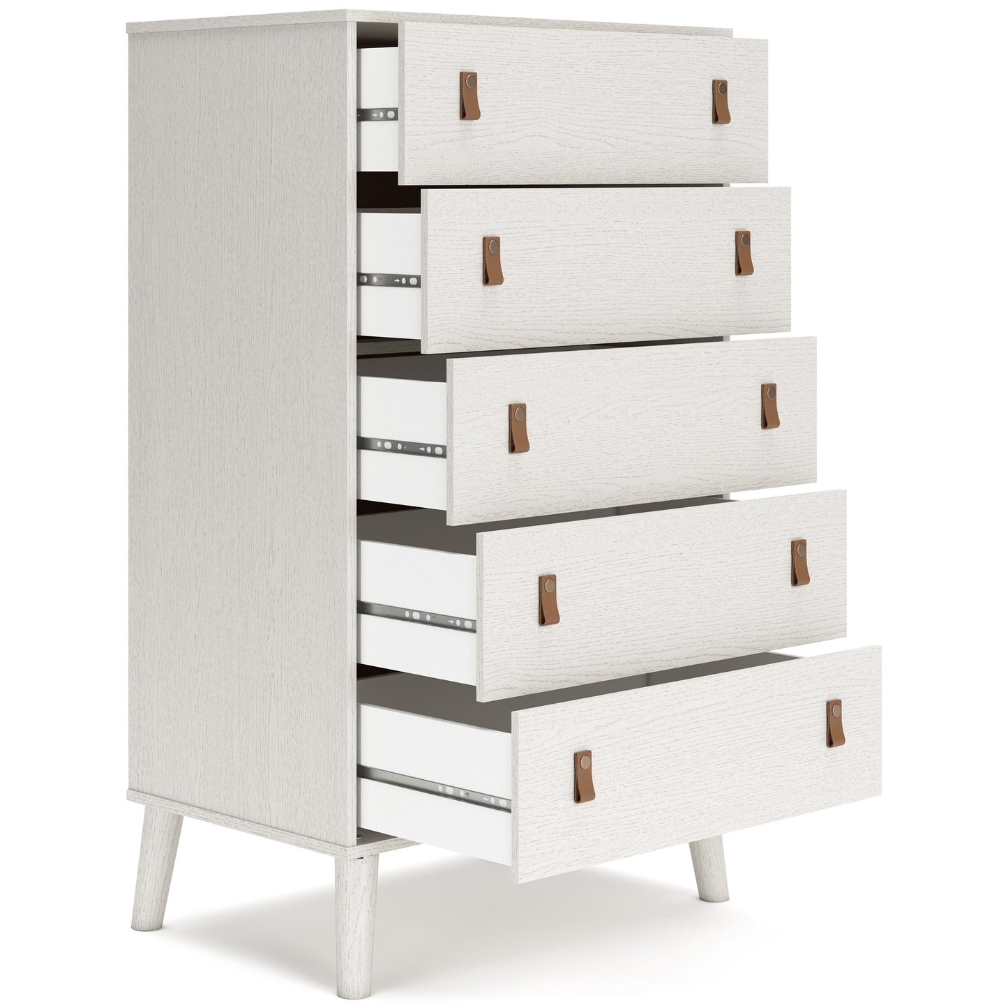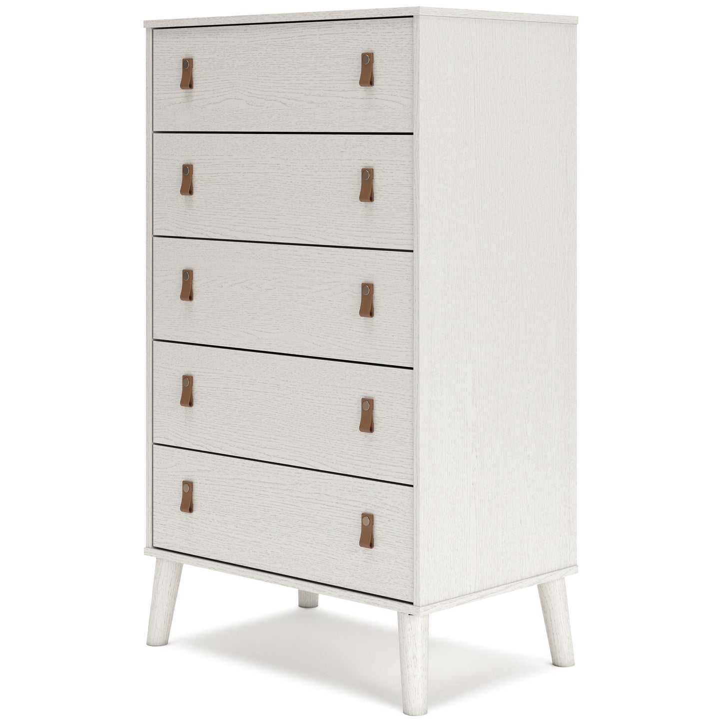 Dare to take minimalism to the max. This chest of drawers has an air of sleek simplicity thanks to its white painted finish with subtle replicated wood grain. Magnificently mod splay legs are a compelling complement to the streamlined design. And with two sets of faux leather drawer pulls that allow you to customize the chest to suit your space, there's no doubt about it: This contemporary piece is sure to become a classic.