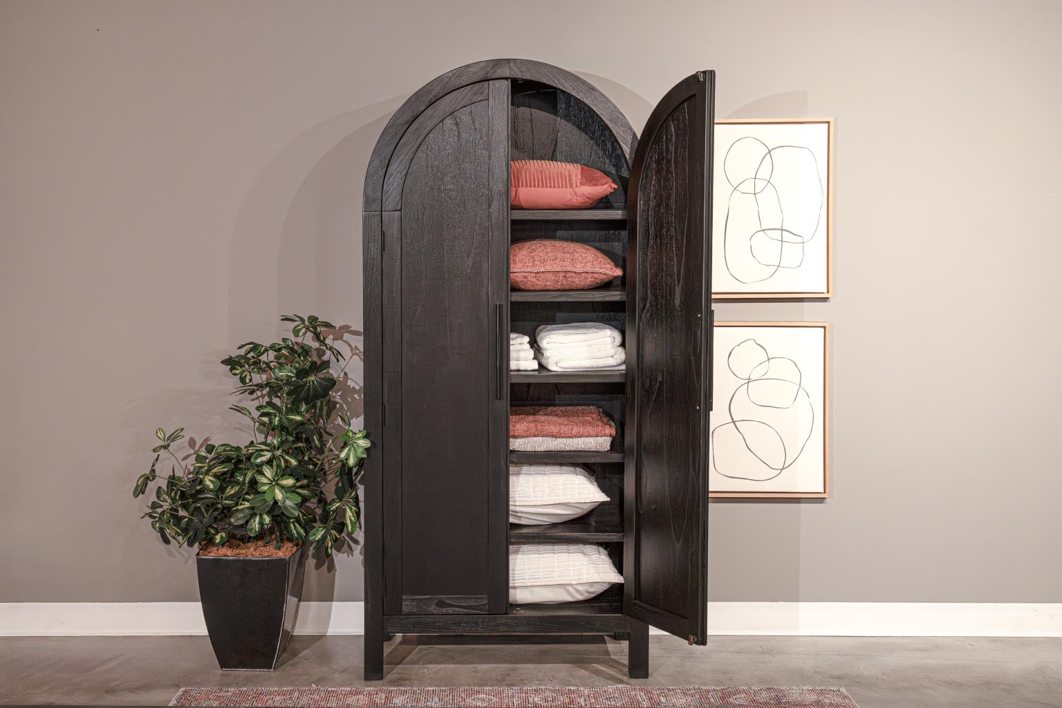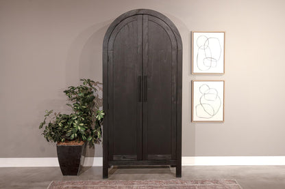 The Bennett arch storage cabinet blends timeless elegance with modern functionality. Expertly crafted in Indonesia from wire-brushed Mindi solids and veneers, this stunning piece features an arched top, two doors, and adjustable shelves for versatile storage. Its textured finish adds depth and character, making it a stylish and practical addition to any space.