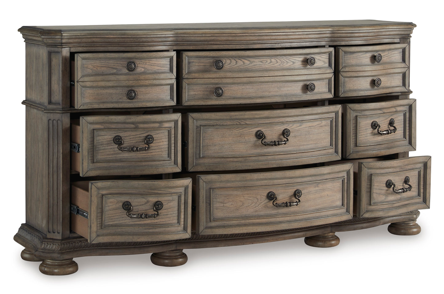 Merging traditional elegance with modern comfort, this dresser takes your bedroom retreat to the next level. Serpentine curves, ash swirl veneer inlays and a glazed antiqued-look finish radiate timeless sophistication. Drawers of various sizes are packed with ample storage possibilities. Talk about stunning refinement.