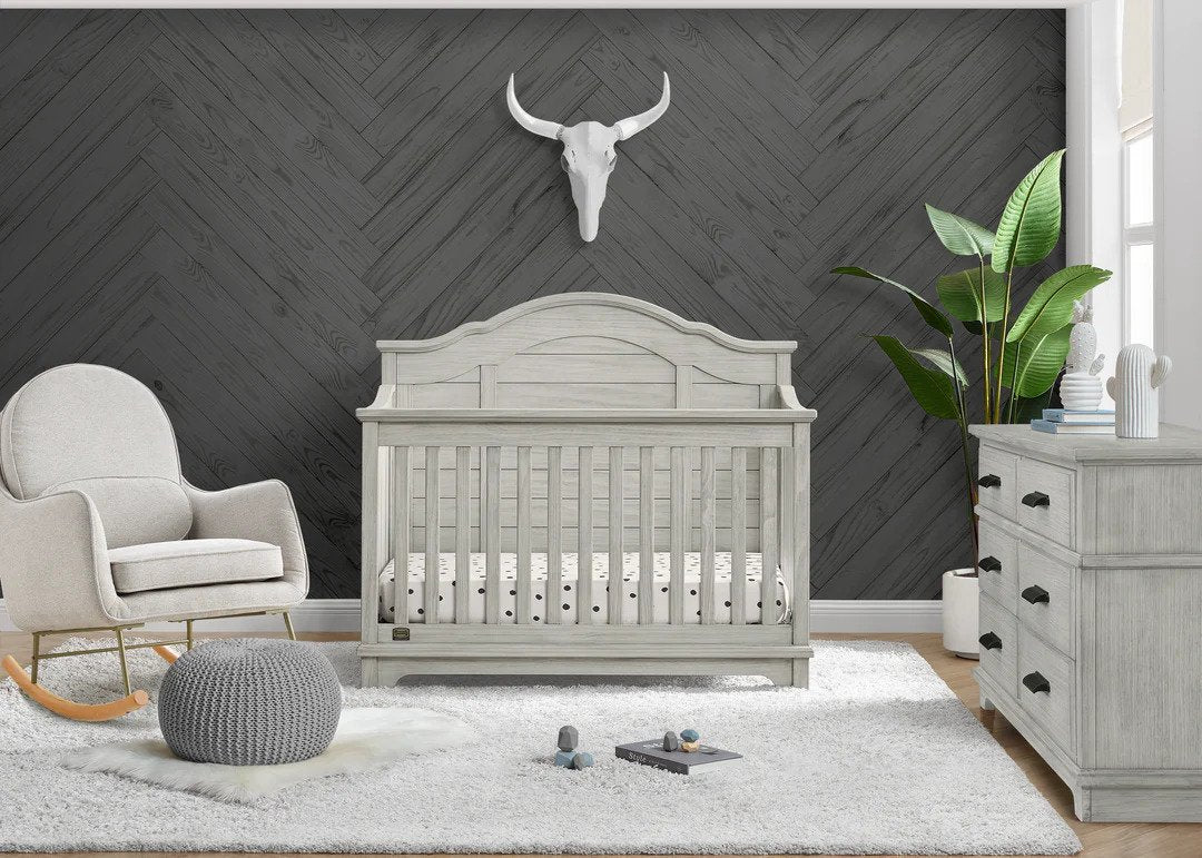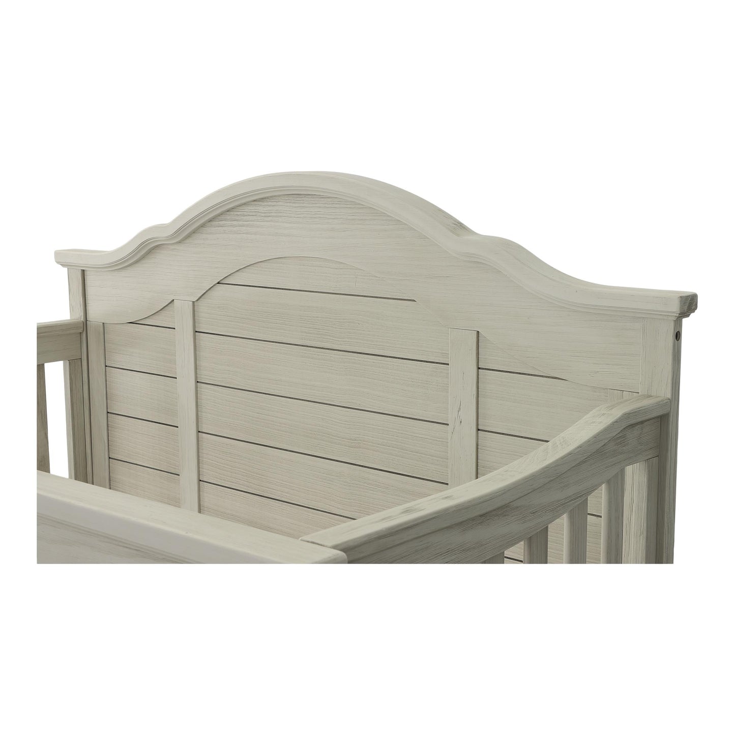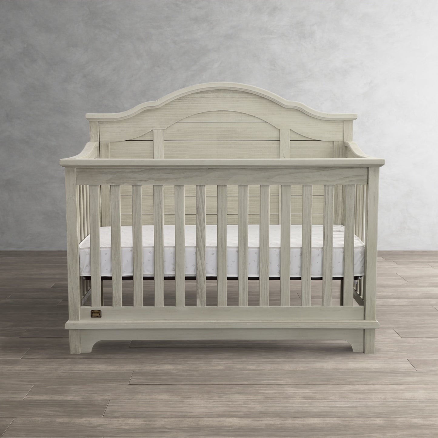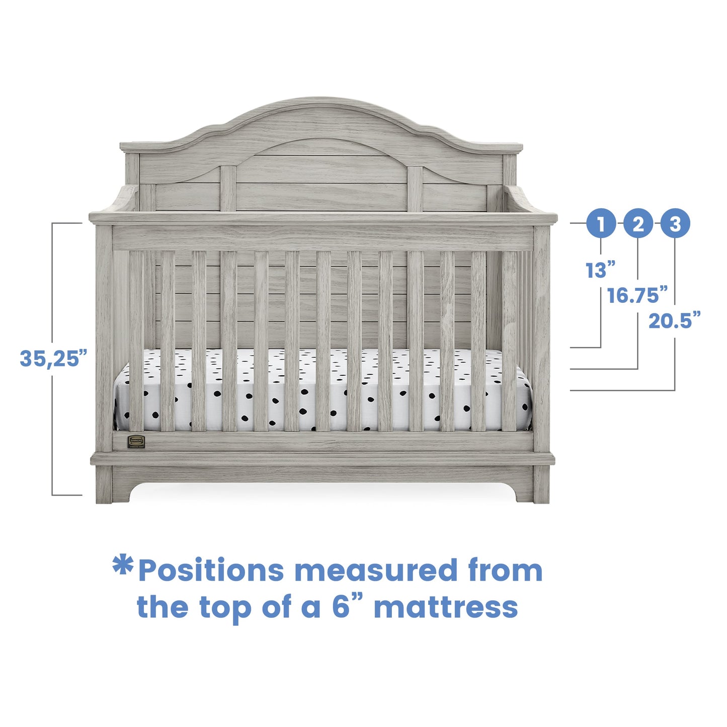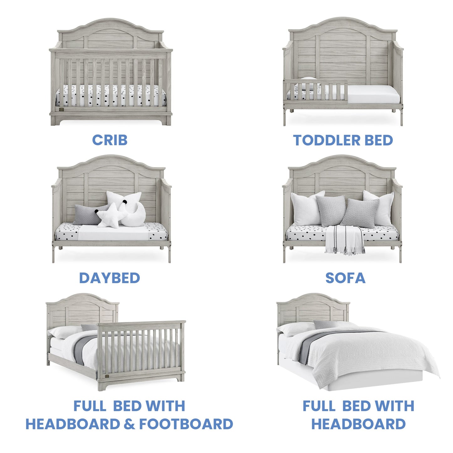 The elegant curves and shiplap-inspired headboard of the Asher 6-in-1 Convertible Baby Crib by Simmons Kids are brought to life with a lightly textured finish. A great option for your baby's nursery, this convertible crib features a dramatic silhouette that will make it the focal point of any bedroom for years to come. Its grow-with-me design features three adjustable height levels that allow the crib to be lowered as your child grows, plus it converts from a crib, to a toddler bed, sofa, daybed, full size bed with headboard or full size bed with headboard and footboard. The only bed your little one will ever need, this versatile crib will take you from the nursery to high school, and all the years in between. Toddler Guardrail included; Full Size Bed Rails sold separately. Given the hand applied nature of this baby crib’s finish, variations in the wood are to be expected and celebrated.