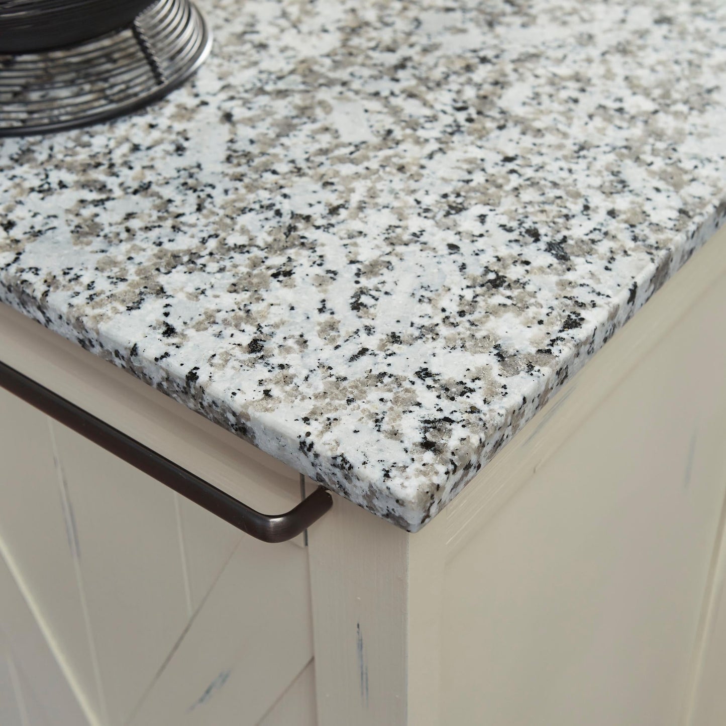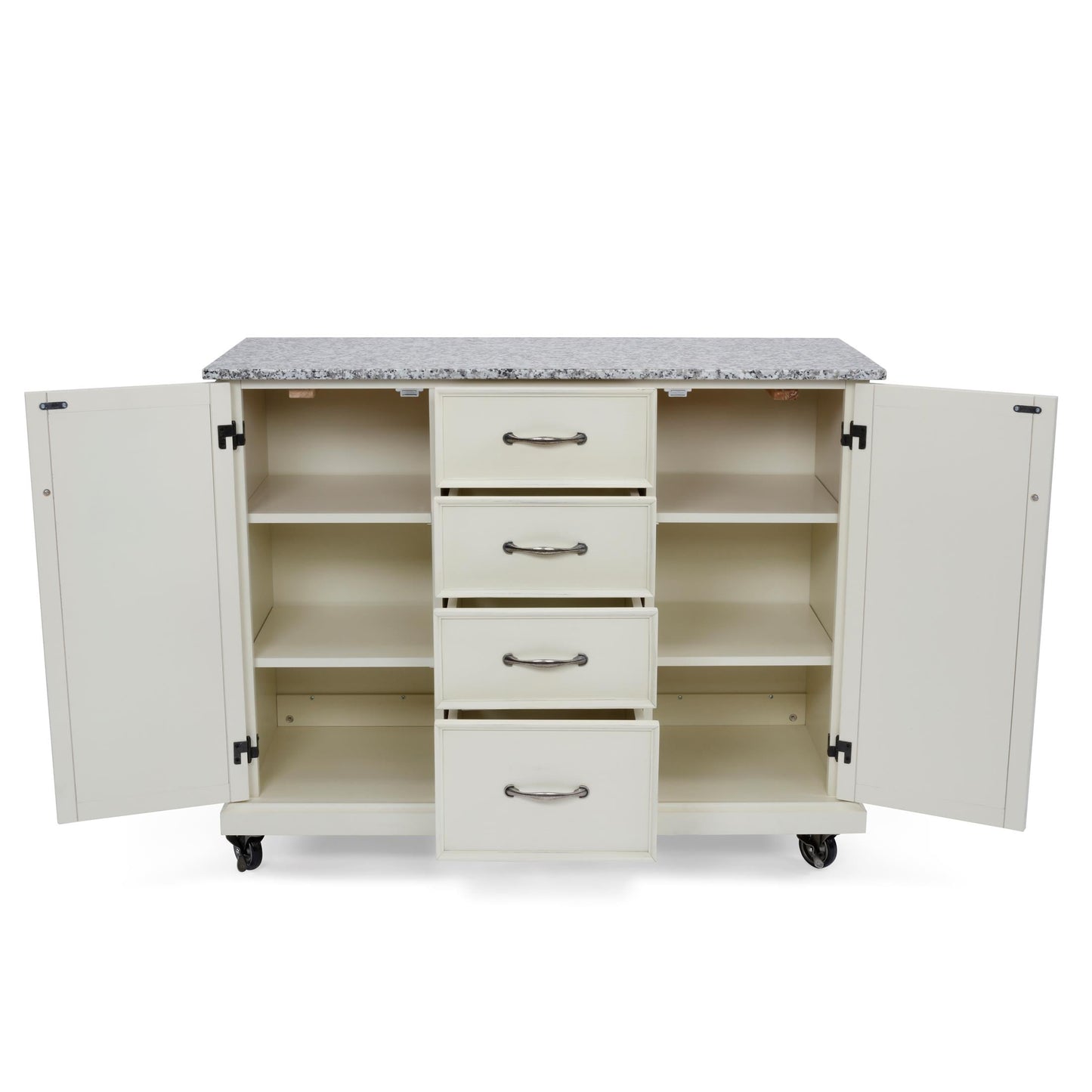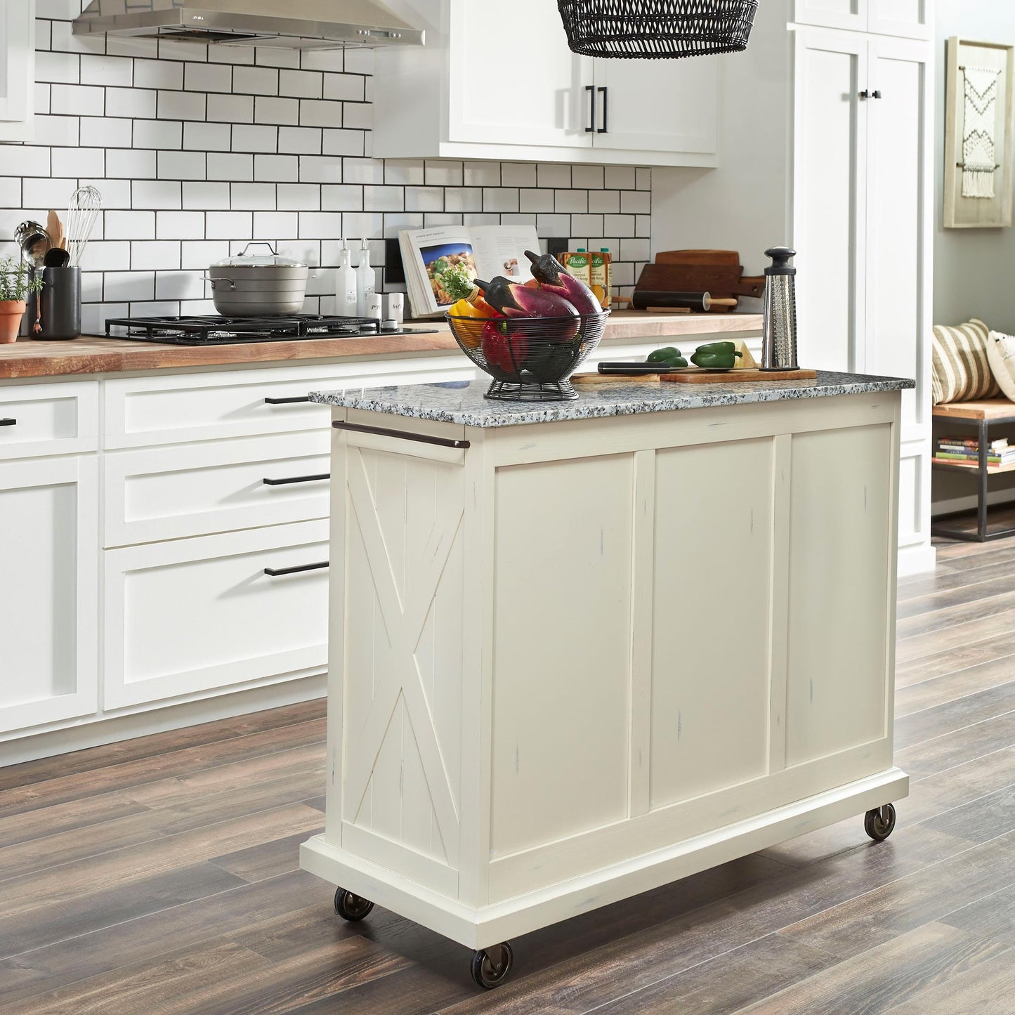 Beachside flair styling combined weather wood look. Crafted of hardwood solids and engineered woods that features solid wood “X" frame design, with inset wainscot panels with all body surfaces wired brushed to provide a rough-hewn look. Off white painted body with hand rubbed and sanded highlighting, with salt and pepper natural colored granite top. Finished on all four sides so it can be used as an Island. Casters on all 4 corners for easy mobility, with 2 of them locking.