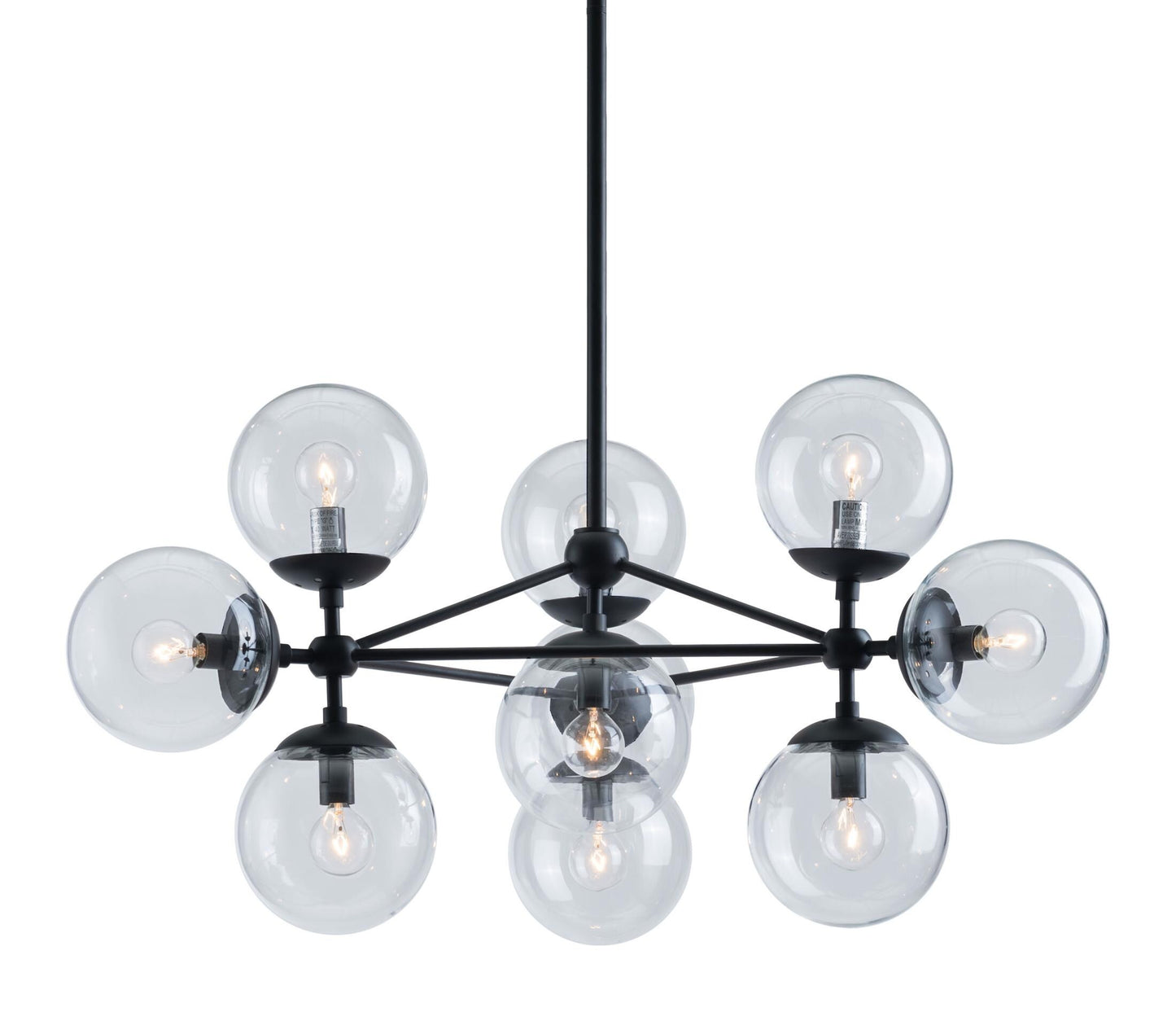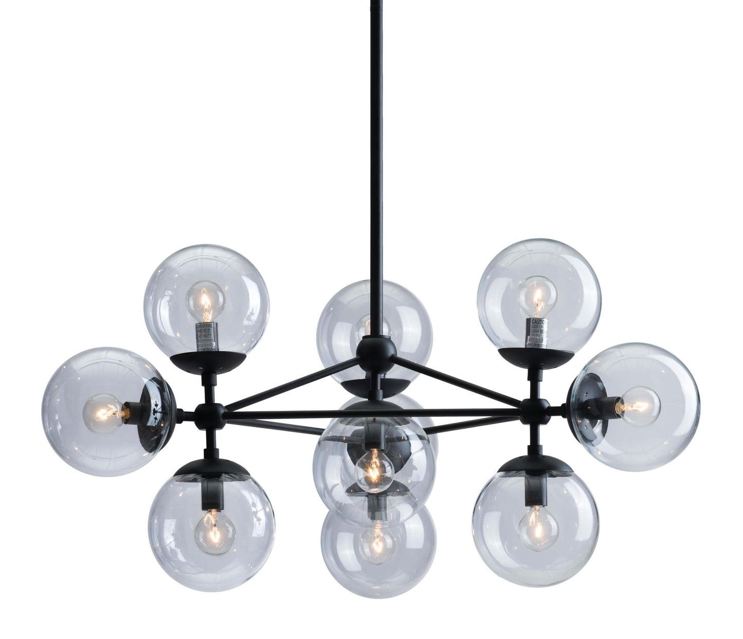 Mid-century inspiration results in this ten light modern masterpiece. Its black metal frame with a dimensional three-point design and clear glass globes make it so versatile. It will hang perfectly over a dining table & look stunning in an entry. The perfect choice to beautifully illuminate any space. Bulbs are included.