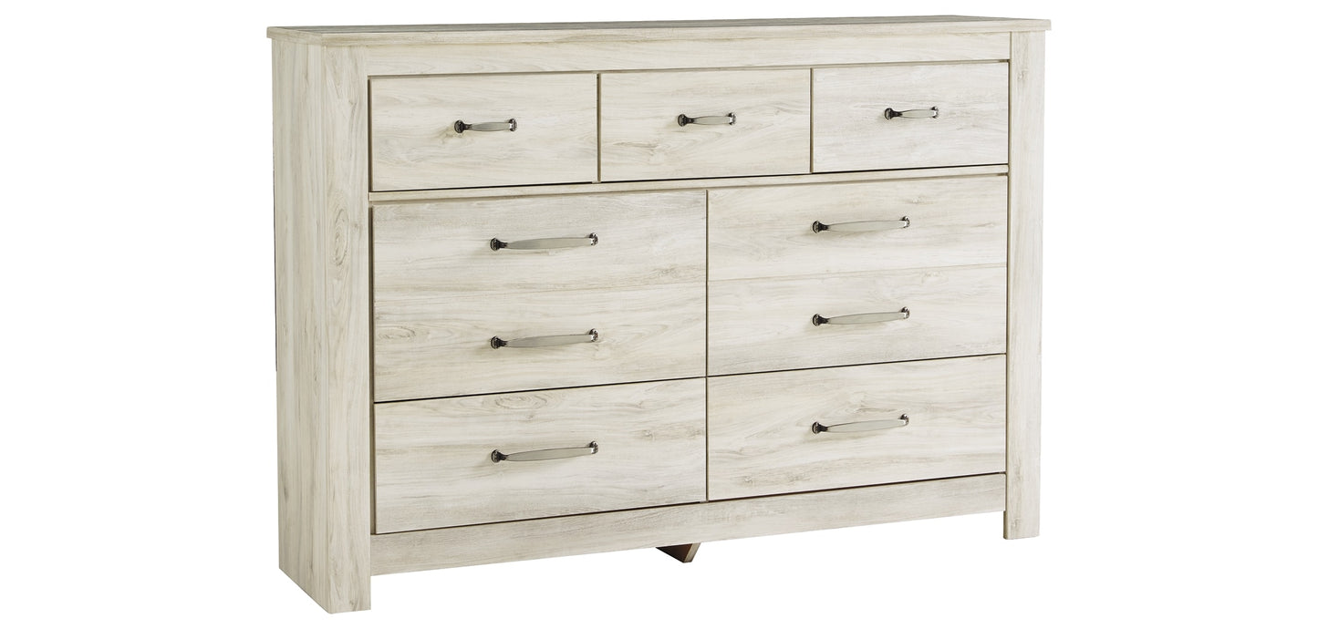 Your bedroom isn't just a room. It's a canvas. Express your farmhouse style with this dresser. Wispy white finish over replicated oak wood grain brightens up the space with charm. Brushed nickel-tone handles with black edging finesse the piece with a bit of shine. Drawers are spacious and lined with faux linen laminate to hold your belongings with care. This clean-lined profile is the perfect authentic foundation for inviting decor.