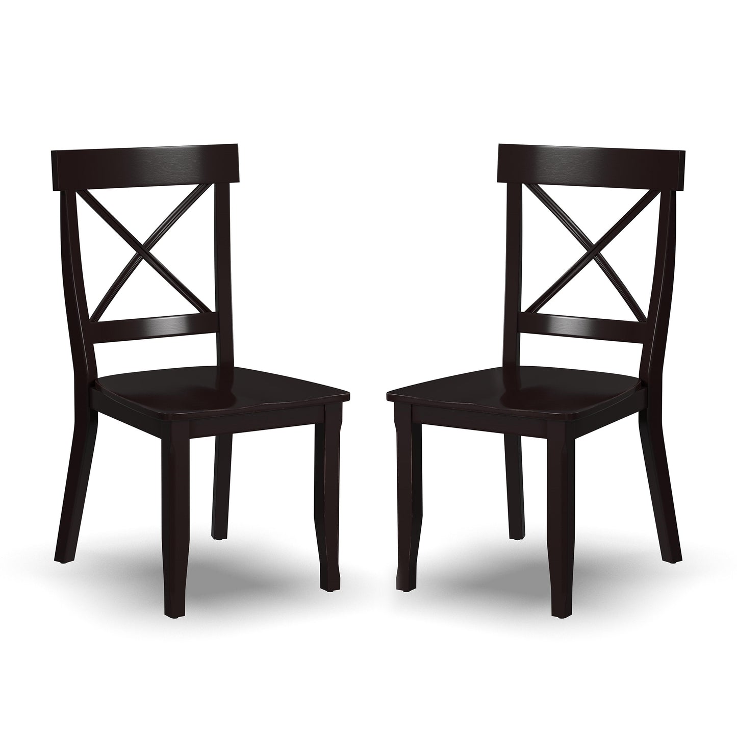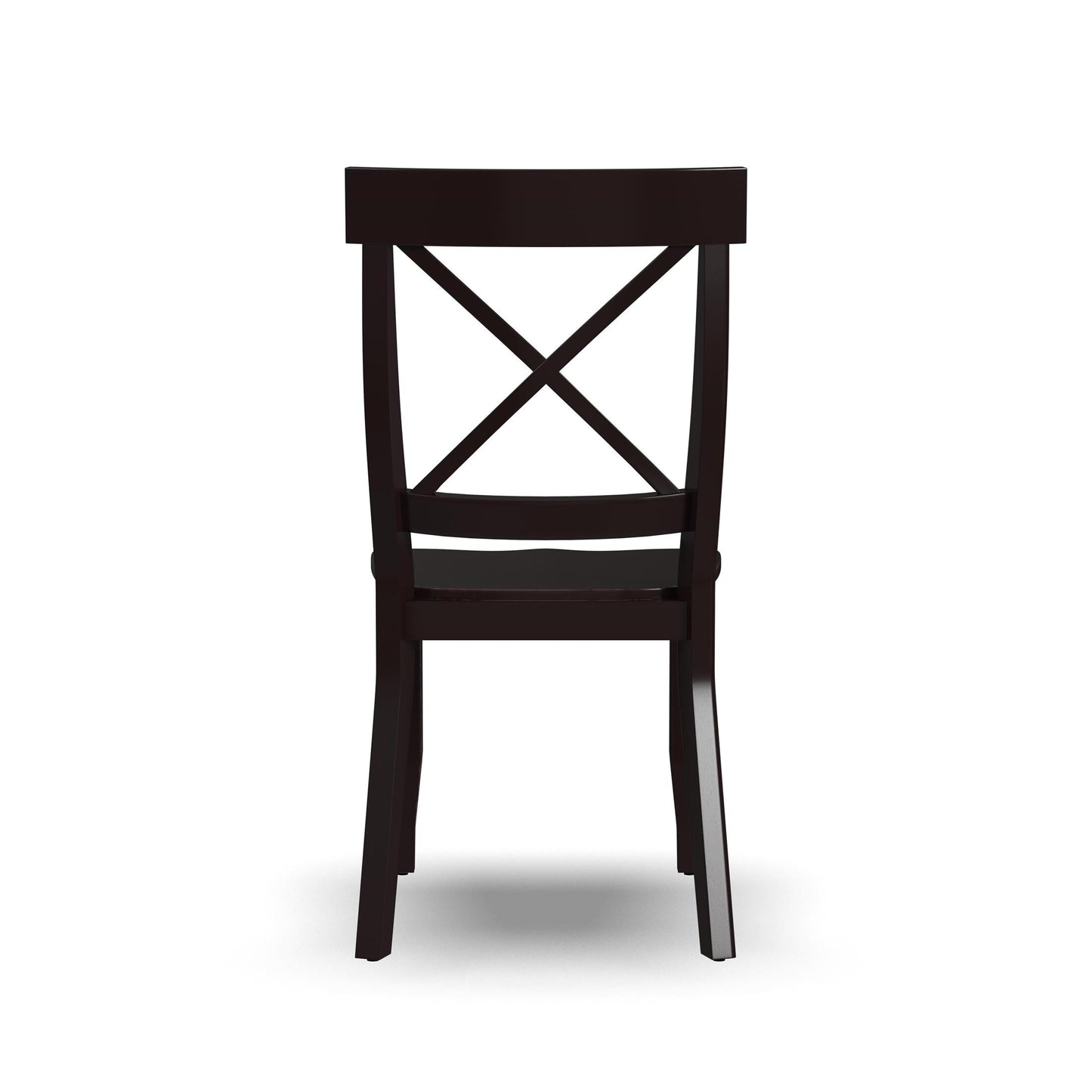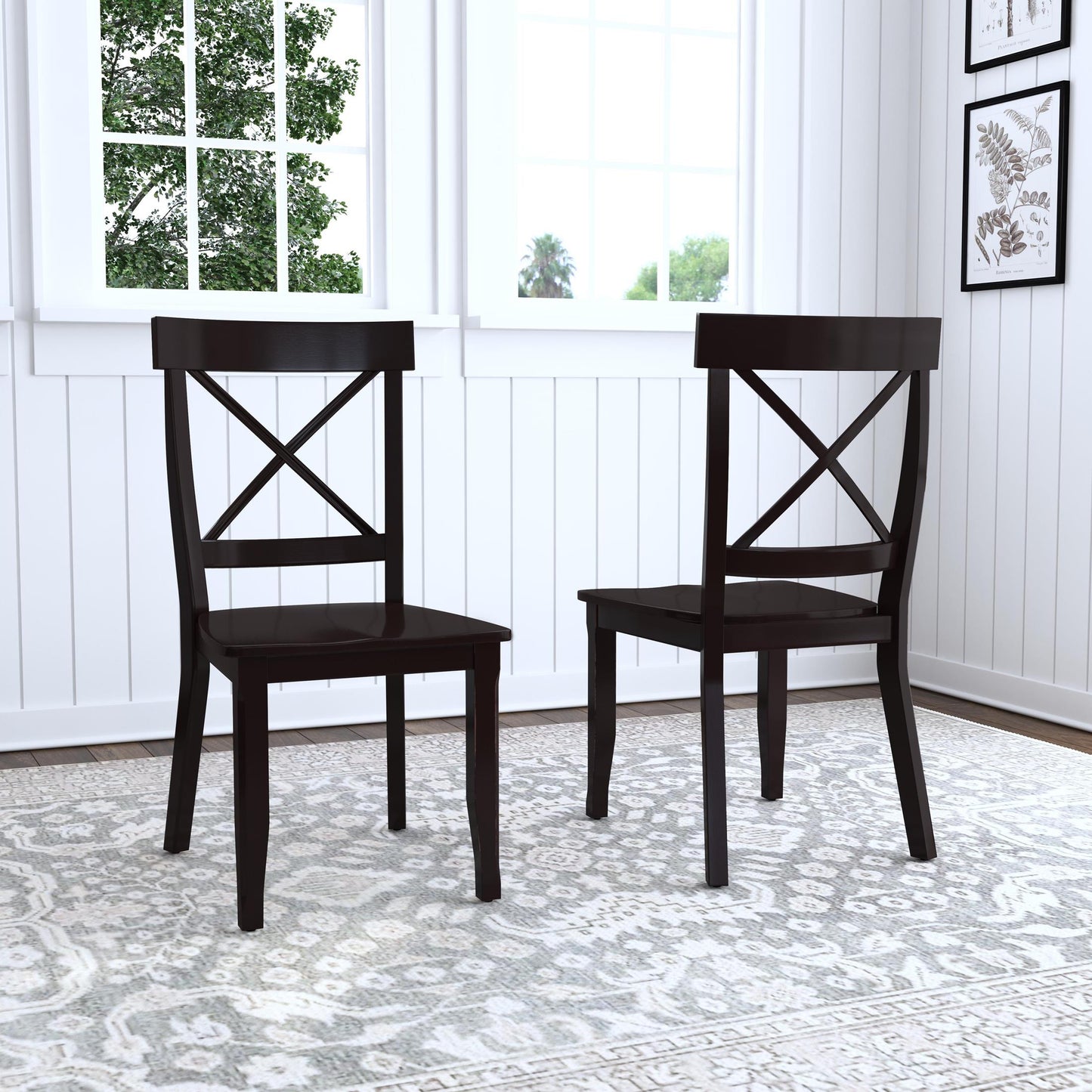 Pull up a couple chairs to have a conversation with a best friend or add a couple more chairs to an existing table and chairs with this Homestyles Blair Chair Set. This pair of dining chairs is accented by an X-back, contoured seat and tapered legs. Each one has an attractive black finish that is easy to match. Whether using as side chairs or pulling up to a table, the comfort and style will last as long as the durable construction.