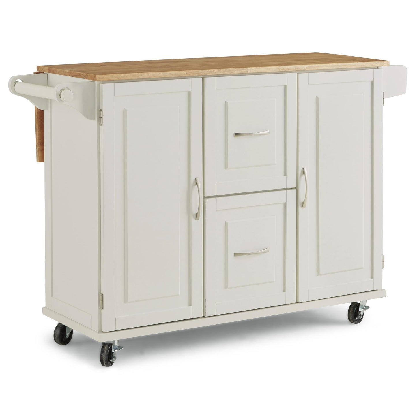 Enhance your kitchen area by adding the Blanche Kitchen Cart by homestyles. It is crafted of solid hardwood and engineered woods in a white painted finish with a natural maple-finished, solid wood top. It includes a drop leaf that adds an additional 11.75" to the work/dining surface. Storage includes two single cabinet doors that open to reveal two adjustable shelves inside each, two deep storage drawers, a towel bar and spice rack. Features brushed nickel hardware and two locking casters.