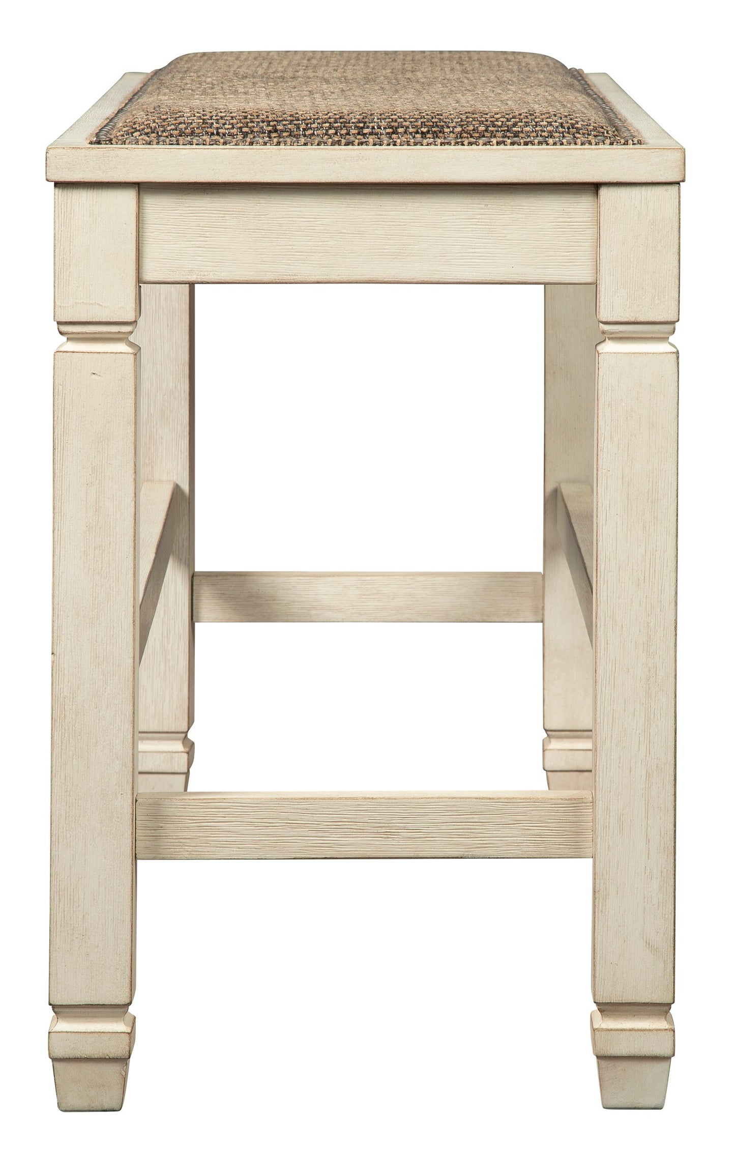 The beauty of this upholstered dining bench is something to savor. Serving up comfort and flair, this generously scaled counter-height bench entices with a cushioned seat covered in a heavy woven fabric that complements the antiqued white finish.