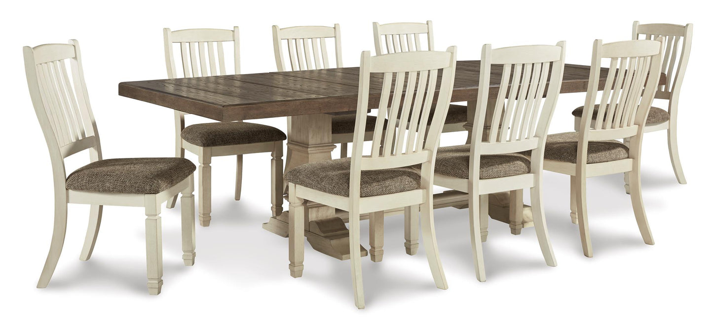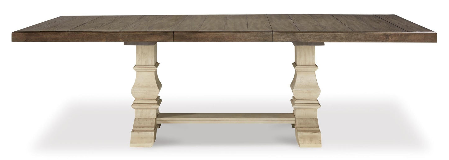 Whether your style is farmhouse fresh, shabby chic or country cottage, you'll find this extension dining table works on so many levels. The table's two-tone finish, with weathered gray on the tabletop and textured antiqued white on the double-pedestal base, offers twice the character and twice the appeal. An extension leaf makes it easy to comfortably add more guests in no time.