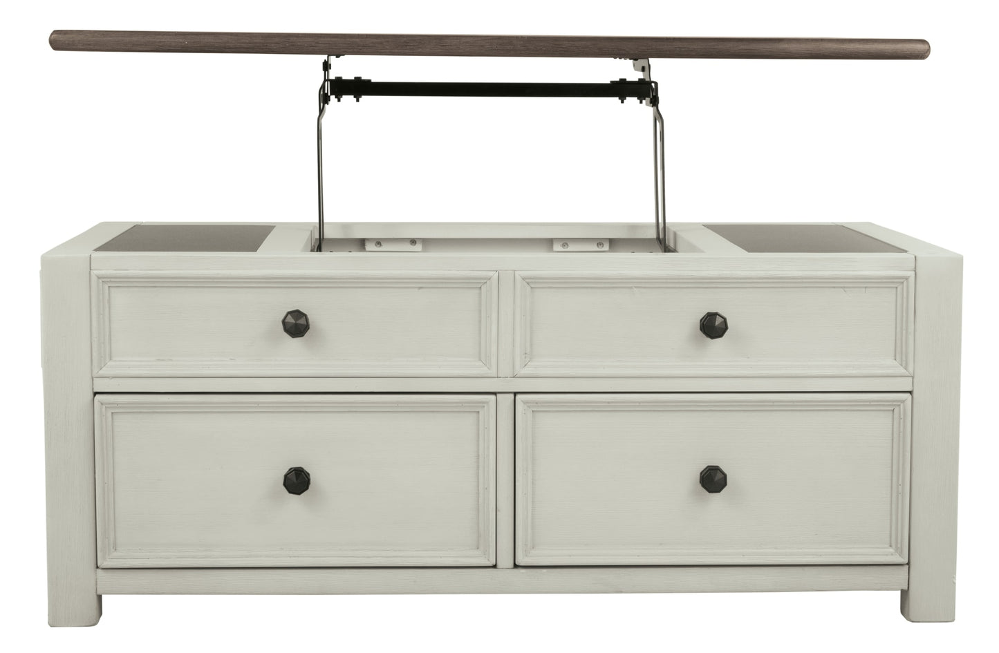 Store, serve and showcase your favorite things with this lift top cocktail table. Its textured antique white finish creates a vintage two-tone look that will endure for years.