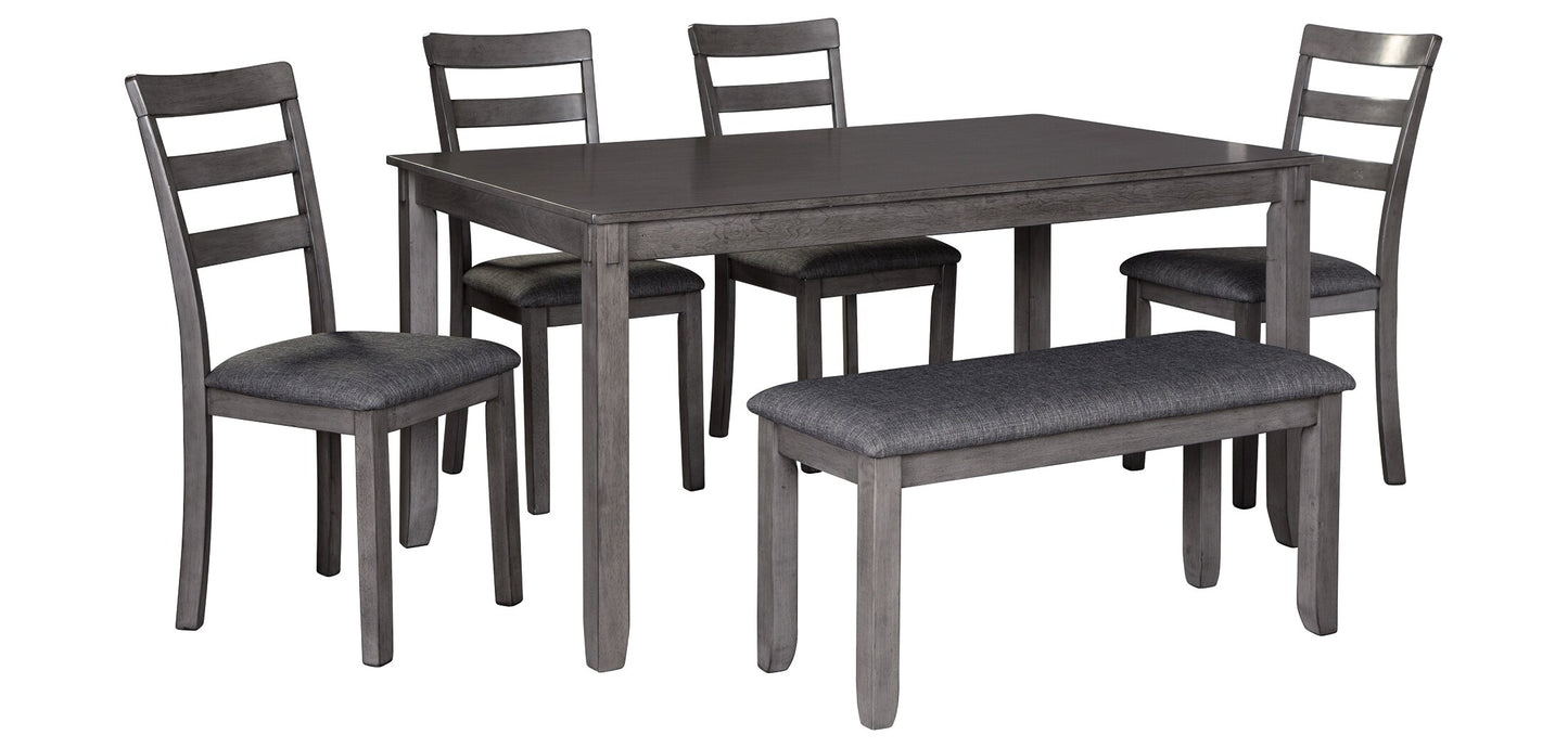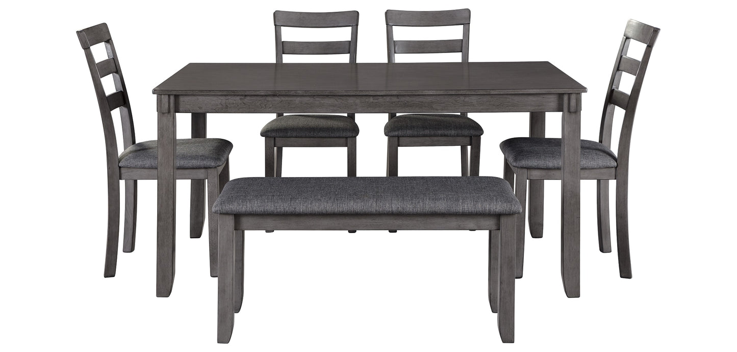 It's so easy being gray—at least this 6-piece dining set makes it seem that way. This transitional dining table set sports a charcoal gray finish with textured gray upholstery for an on-trend and relevant appeal. Plushly upholstered seat cushions in a practical polyfiber make it a pleasure to linger at the table. Brilliantly styled seating choices add interest and versatility at mealtime.