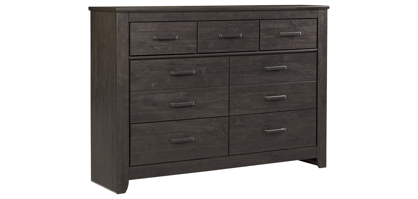Priced to entice and styled to impress, the Brinxton dresser makes the most of a clean-lined, contemporary profile. With three drawer sizes scaled to meet your needs, the design merges cool form and practical function. Replicated oak grain effect gives the modern, charcoal gray finish warmth and character. Linear pulls are a sleek touch.