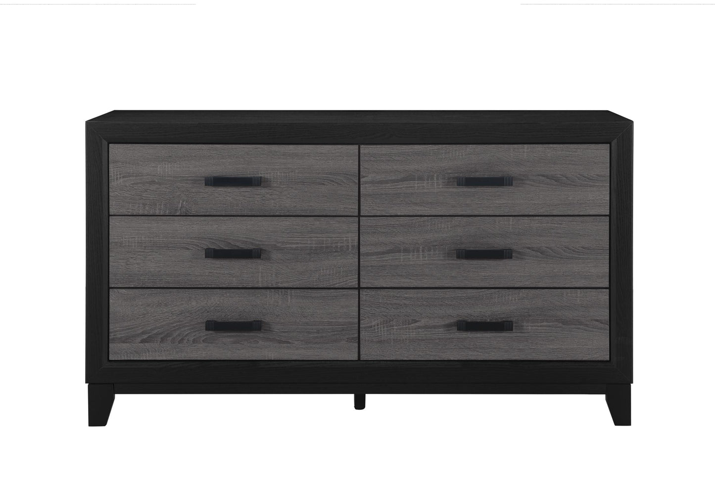 WIth its urban farmhouse design, the best of farmhouse and urban living combine to create an upscaled farmhouse appearance. The case pieces are black with rustic grey wood inlay,. In addition to the two-tone design, the metal hardware completes the mixed media look and adds a modern flair.