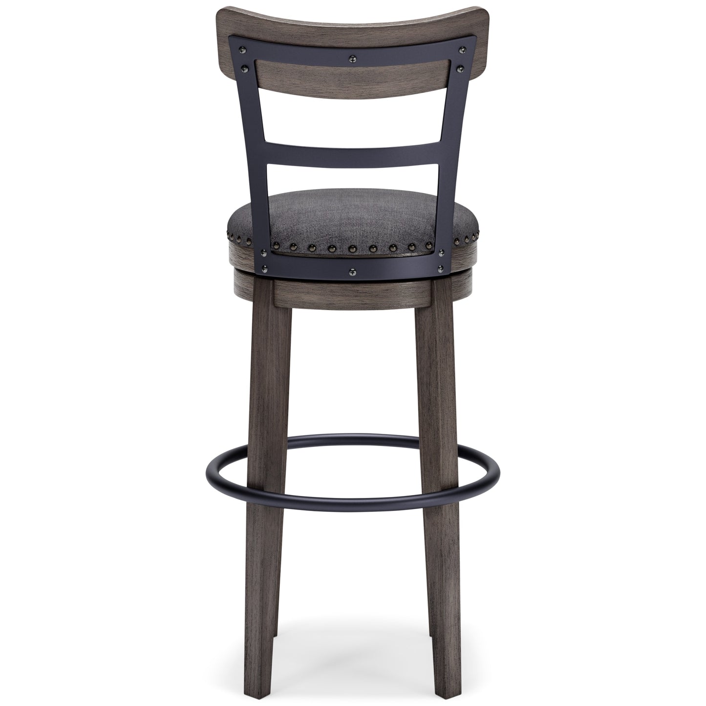 Bring a relaxed yet refined sense of good taste to a space with this upholstered swivel bar stool. The sturdy wood frame with contoured backrest is beautified with an antiqued gray wash finish that’s easy on the eyes. Rest assured, this bar stool caters to your comfort with a cushioned seat with gray textured fabric accentuated with nailhead trim. Sensible swivel design keeps you in the flow of conversation.