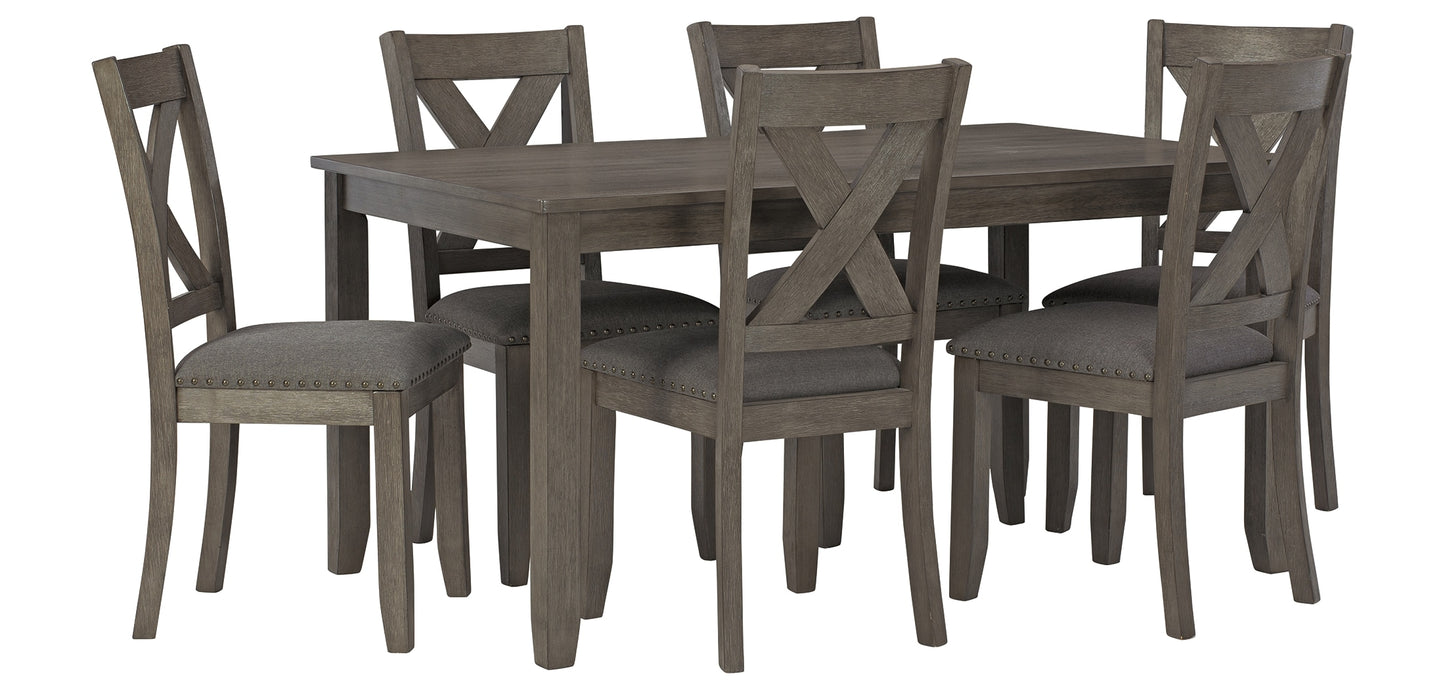 Perfect portion. Striking a simply chic pose, this dining set is styled with fascinating flair. Subtle gray wash finish gives the clean-lined design a casually cool sensibility, while the chair's plushly cushioned seat in a soft, neutral upholstery adds to the allure.