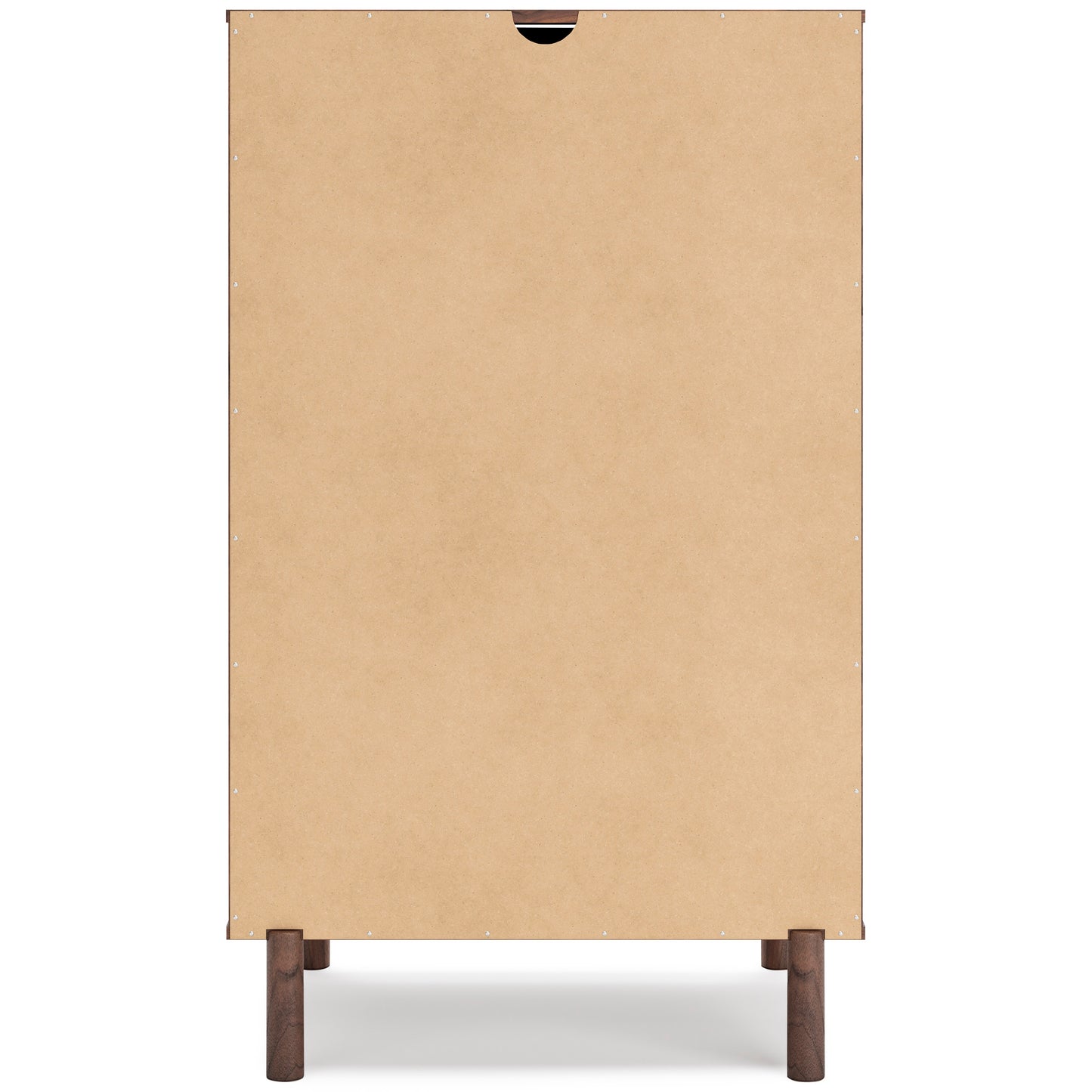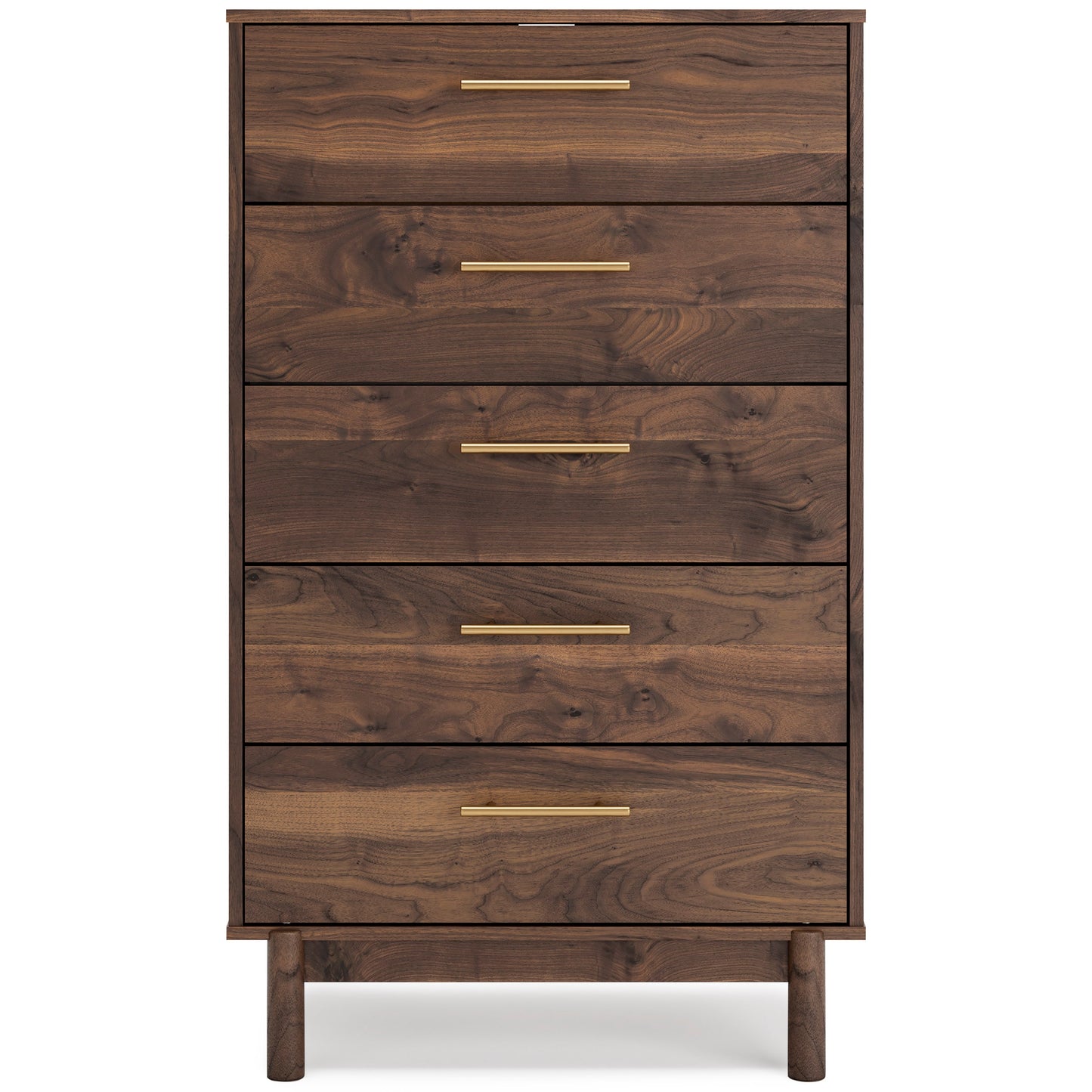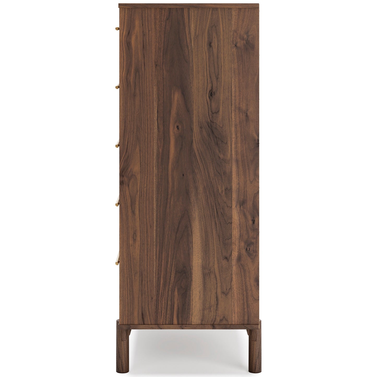 At the intersection of industrial cool and chic sophistication, you’ll find this chest of drawers. With a rich brown finish over replicated walnut wood grain, paired with burnished goldtone handles, it offers an authentic touch that plays well any way you style it. Simple and elegant in its design, this piece keeps your home decor grounded while elevating your modern style.