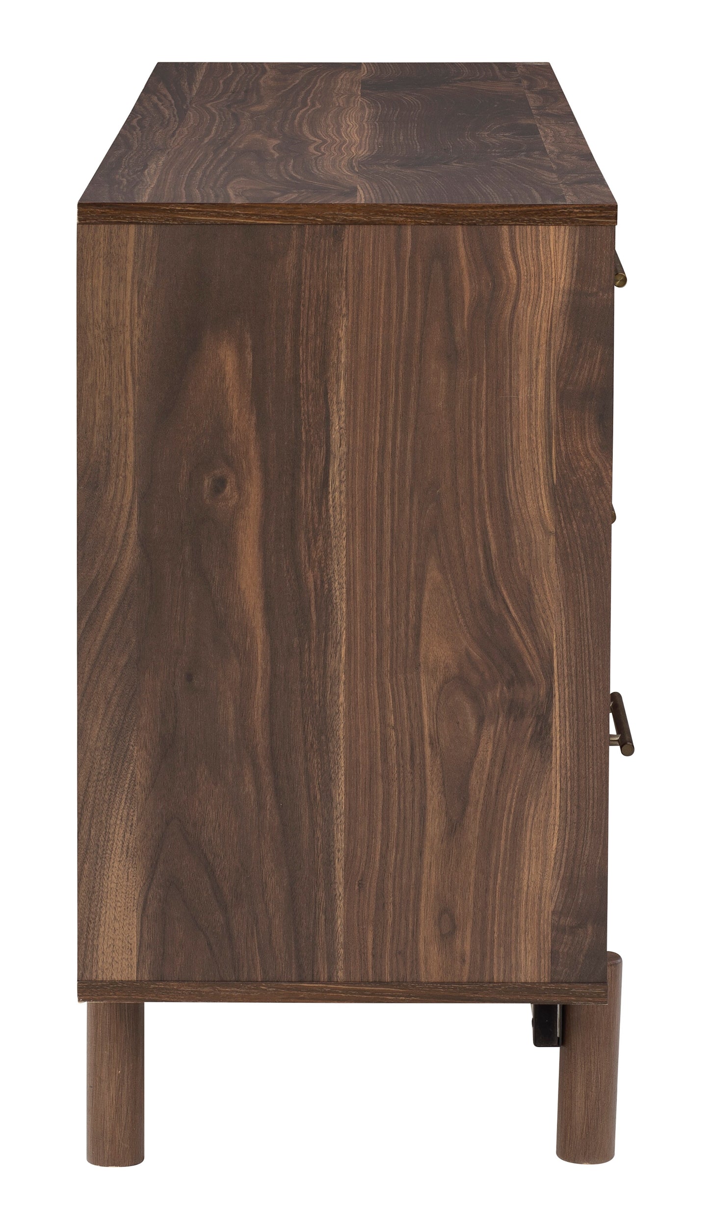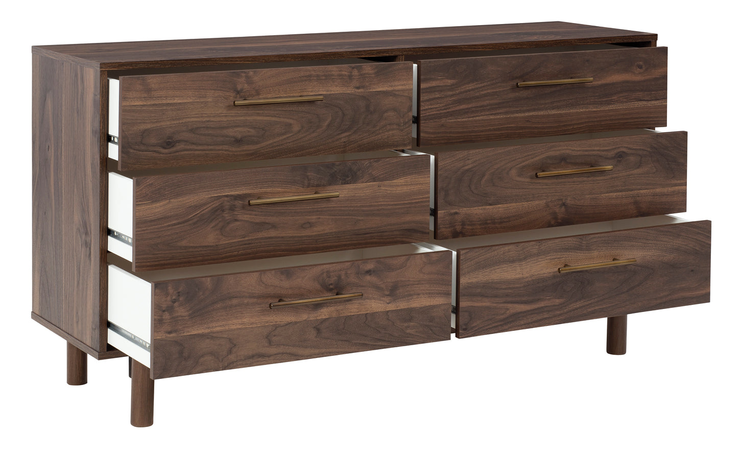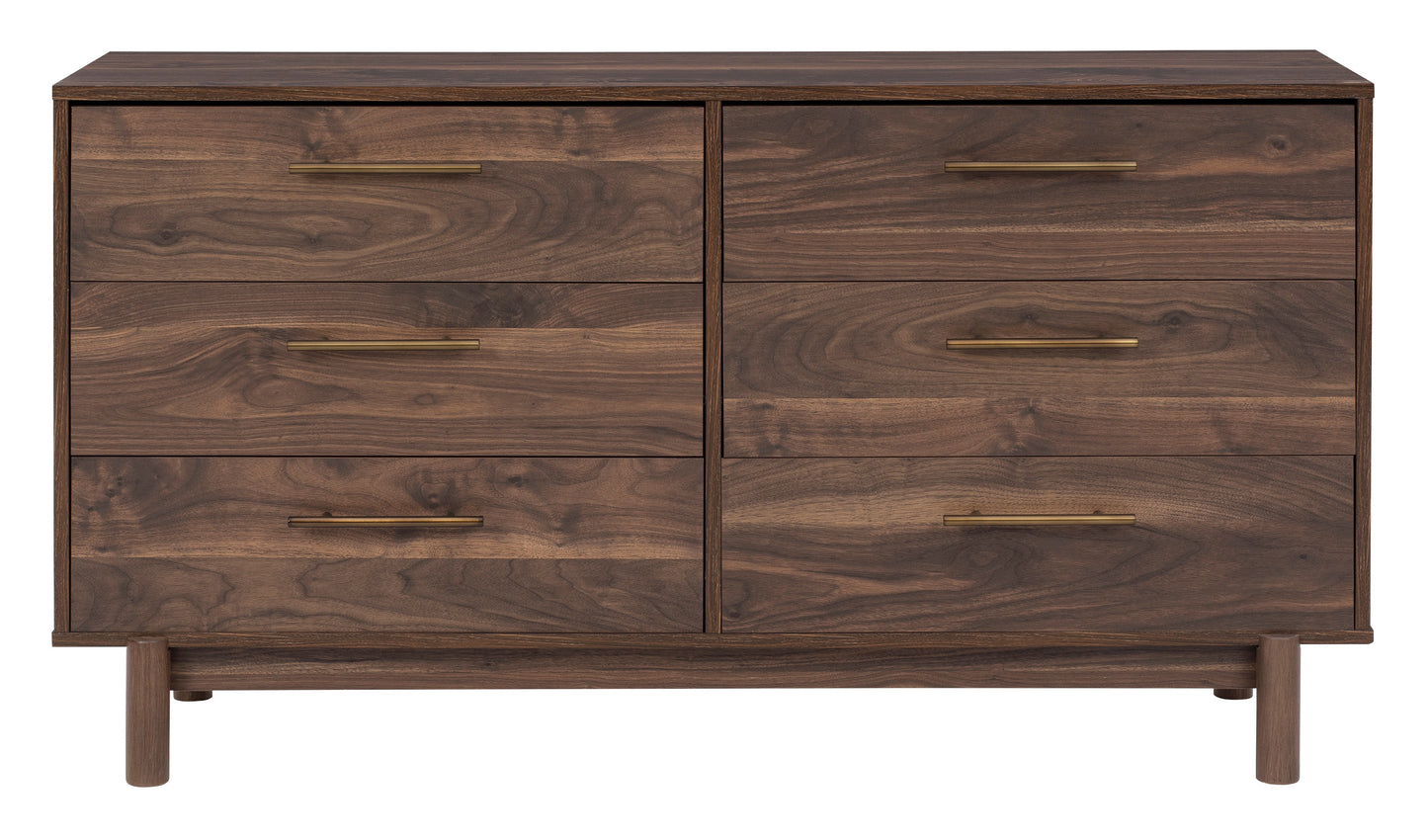 At the intersection of industrial cool and chic sophistication, you’ll find this dresser. With a rich brown finish over replicated walnut wood grain, paired with burnished goldtone handles, it offers an authentic touch that plays well any way you style it. Simple and elegant in its design, this piece keeps your home decor grounded while elevating your modern style.
