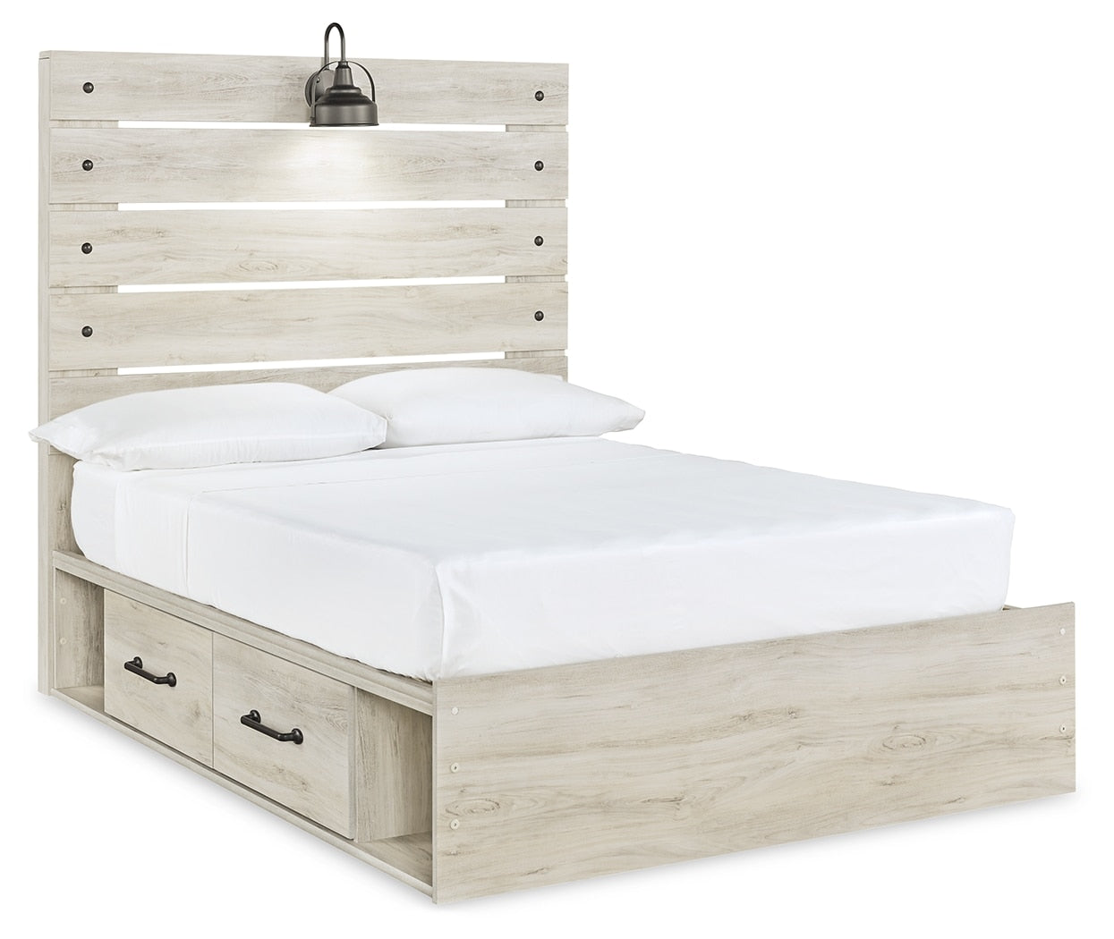 What a delightful take on rustic industrial style. Whether modern loft or modern farmhouse, the Cambeck full panel storage bed makes itself at home. The wispy whitewash palette enhances without covering the grain for that weathered look you crave. Love to read in bed? You’re sure to find the retro-chic light sconce and USB plug-ins on the open-slat style headboard such a bright idea. Elongated drawer pulls on the under bed storage drawers elevate the aesthetic.