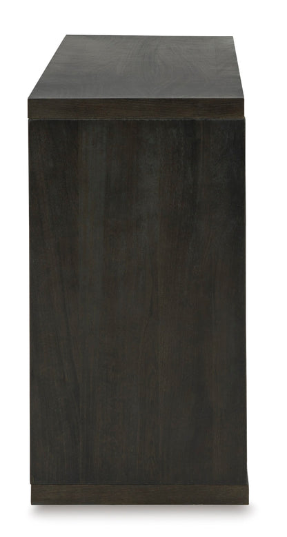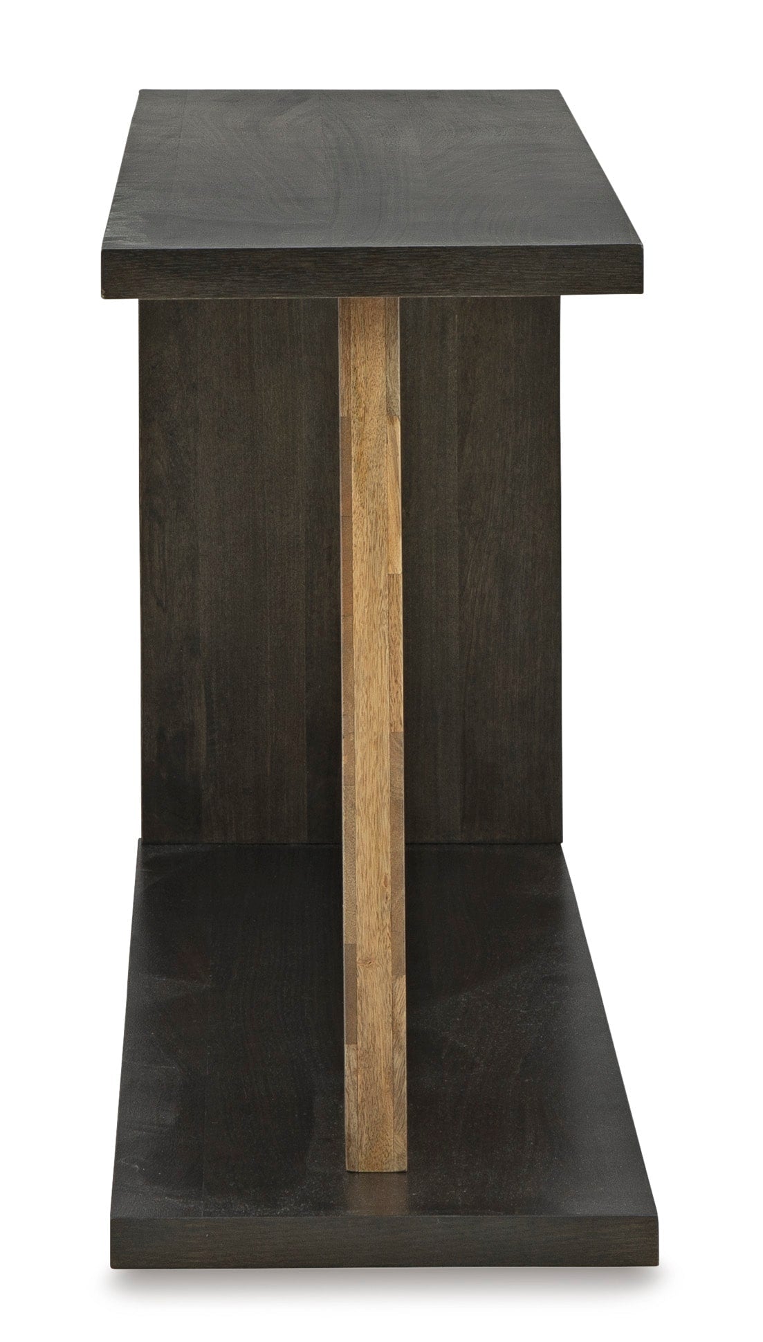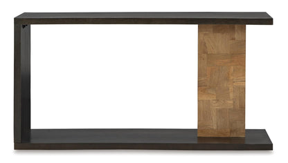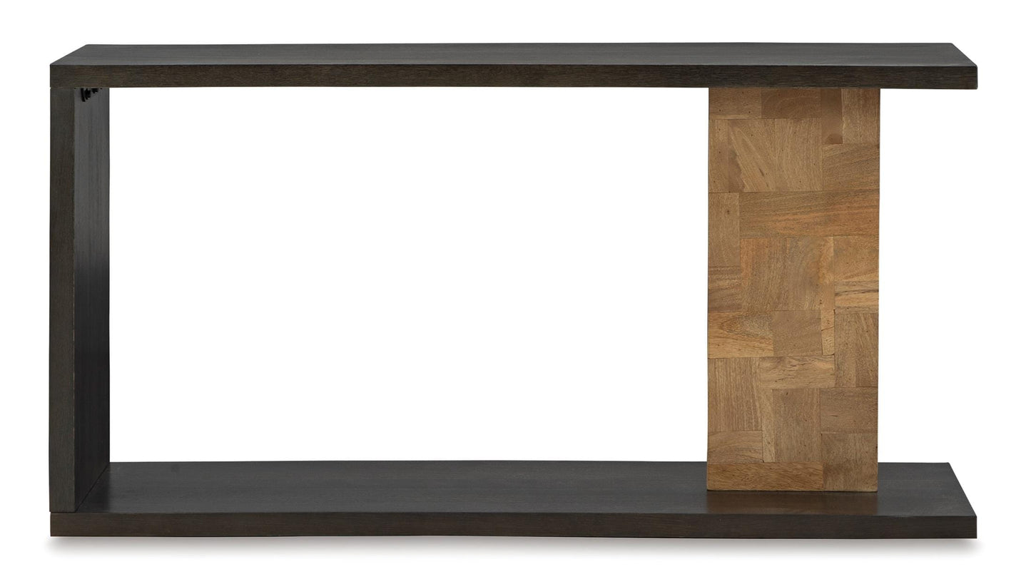 With its clean lines and sense of simplicity, this console table is a master study in modern style. We love how the contrasting patchwork patterned post and the dark brown finish captivate the eye. The lower shelf enhances the open and airy design and provides great display space.