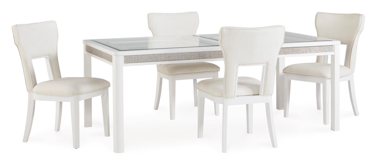 Embracing modern glamour, this dining room ensemble is a sparkling addition to your dining area. A bright white lacquer finish, shimmering rhinestone accents and clear glass panels give the extension table plenty of polish. Upholstered side chairs wow with metallic thread accents and a look all their own.