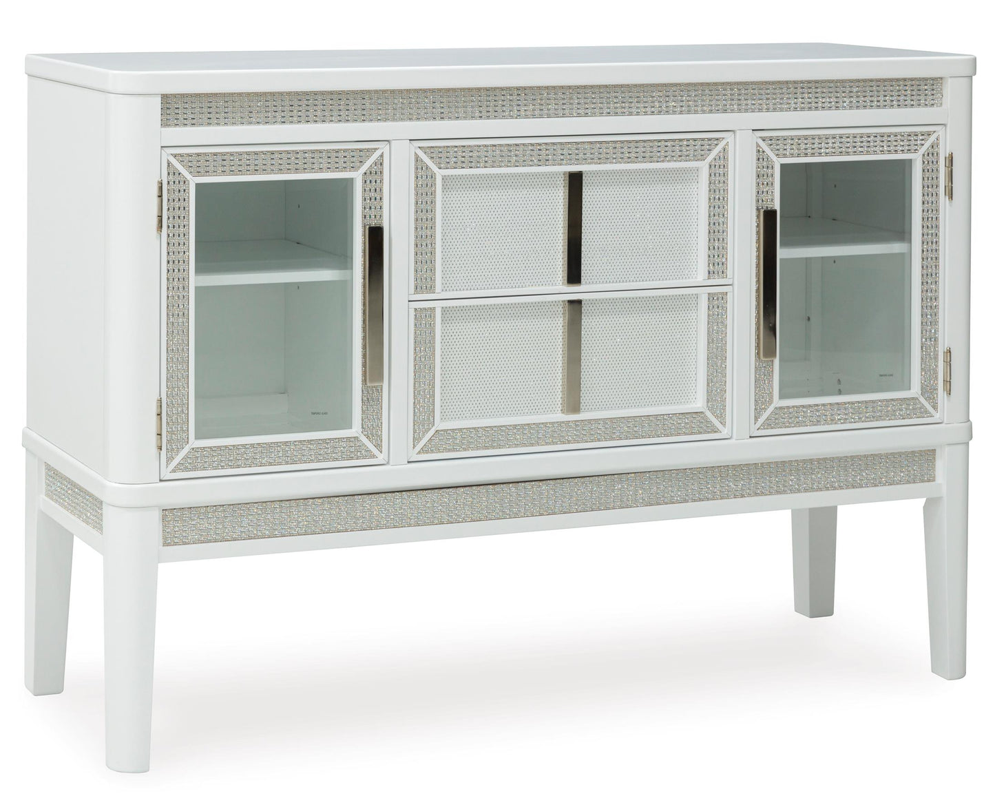 Embracing modern glamour, this server is a sparkling addition to your dining area. The bright white lacquer finish, shimmering rhinestone accents and glass panel doors give this piece plenty of polish. Discreetly placed along the upper valance, white LED lighting adds the perfect finishing touch.