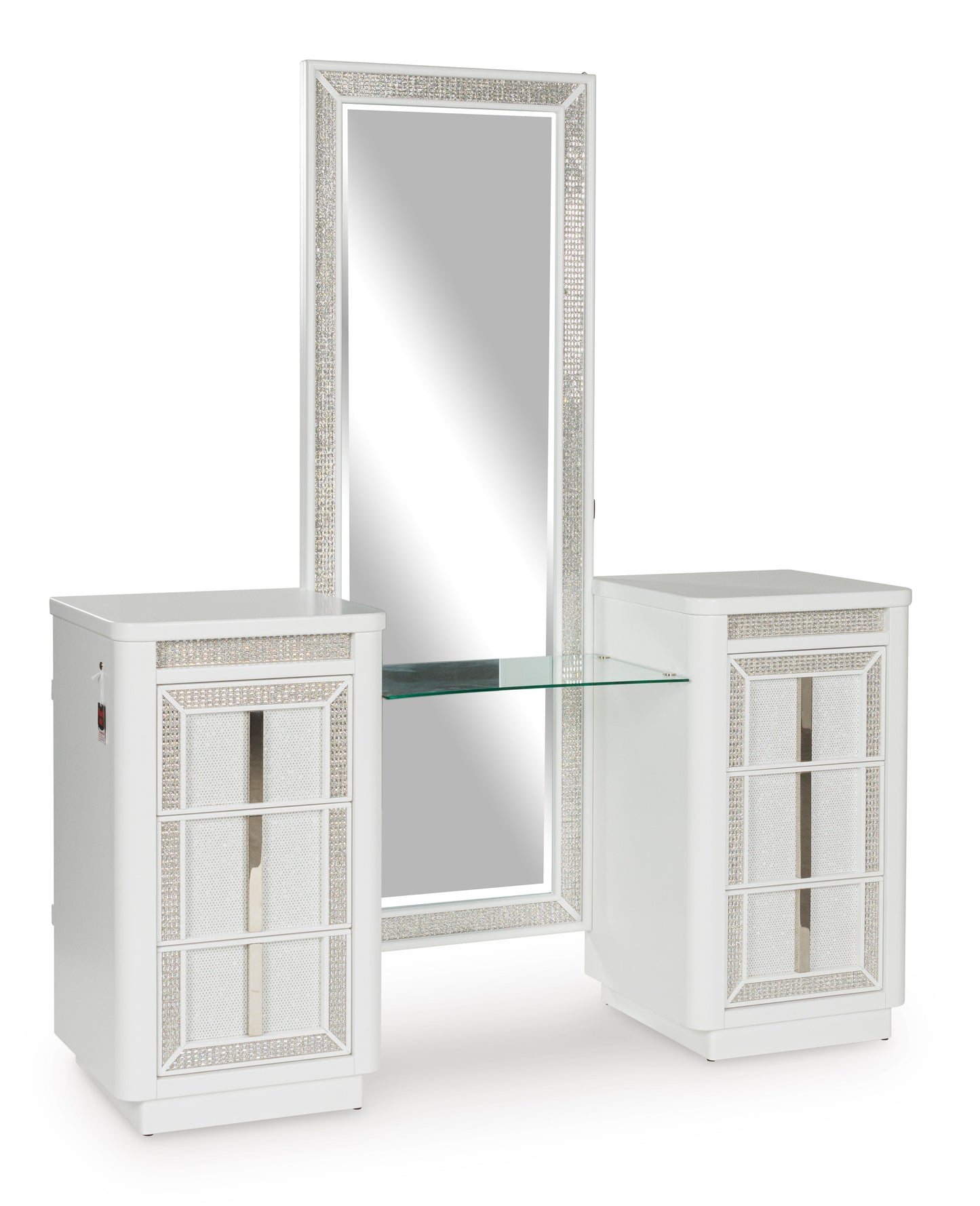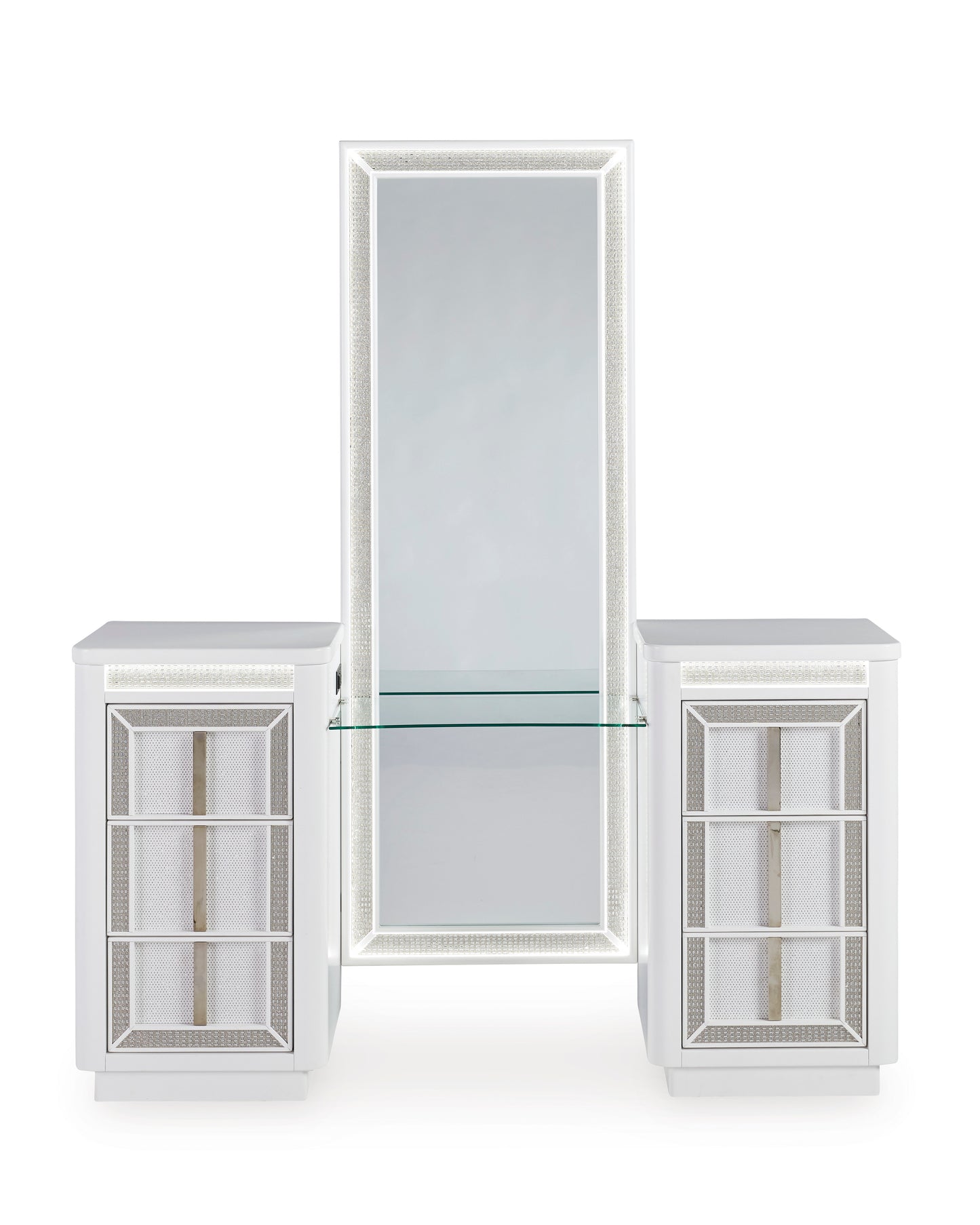 Transform your bedroom with this chic vanity and mirror. Its modern design and glamorous details create a sophisticated retreat. The built-in LED lighting and rhinestone-framed drawers and mirror add style and practical storage while reflecting elegance. Let your sanctuary shine—and never let anyone dull your sparkle.