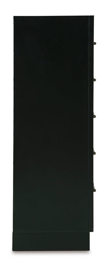 Experience the captivating allure of this chest of drawers, an effortless blend of casual and refined aesthetics. Its two-tone finish combines satin black with a rich brown wood tone for a modern, relaxed vibe that you'll love waking up to. Perfectly suited for your contemporary home, this chest has plenty of drawer space to tuck away your wardrobe and spare bed linens.