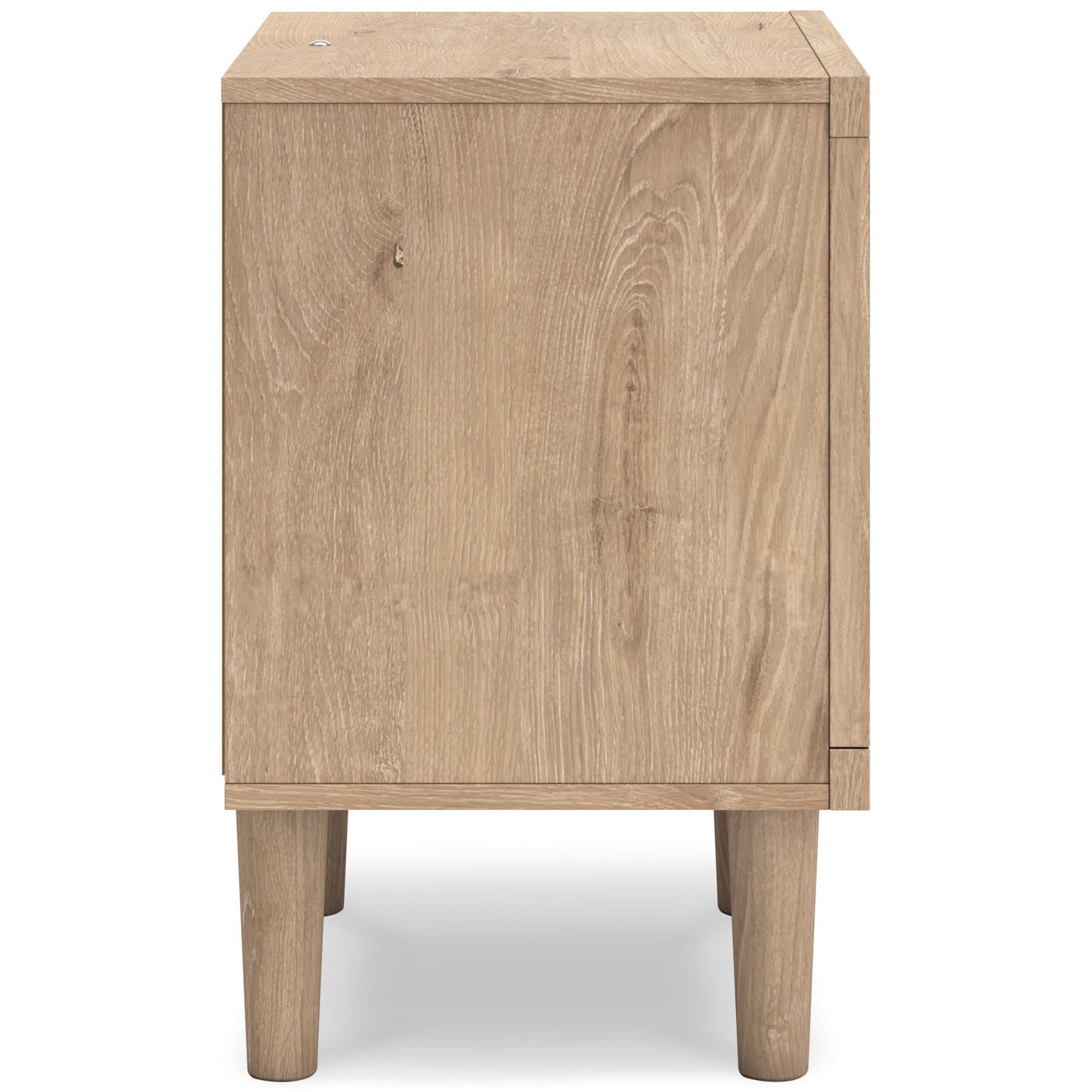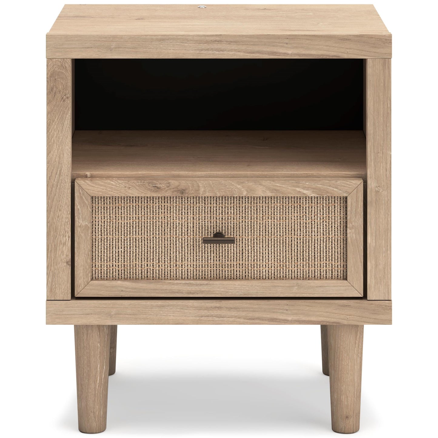 Clean-lined and contemporary—but far from stark—this nightstand is a fresh style awakening. Pairing a light finish with replicated oak grain and textured beige cane details, its mixed materials bring a naturally versatile vibe to your bedroom. Sleek, simple hardware plays perfectly with the modern aesthetic. A smooth-gliding drawer and USB charging keep your clutter contained and your gadgets powered. Warm LED lighting not only illuminates your restful retreat but also adds a touch of unmatched style.