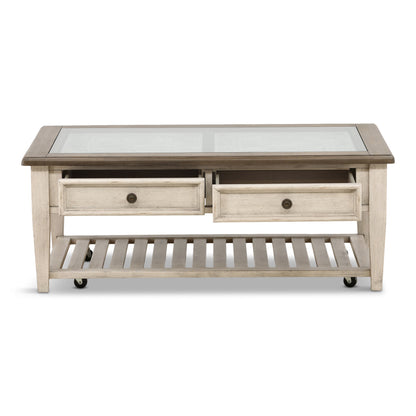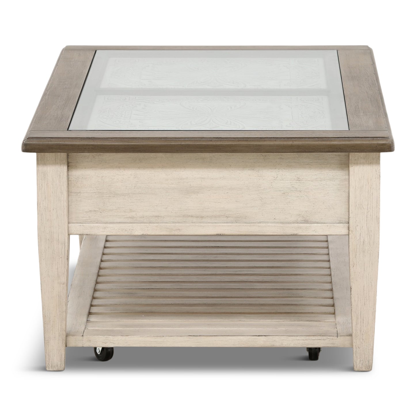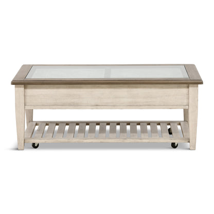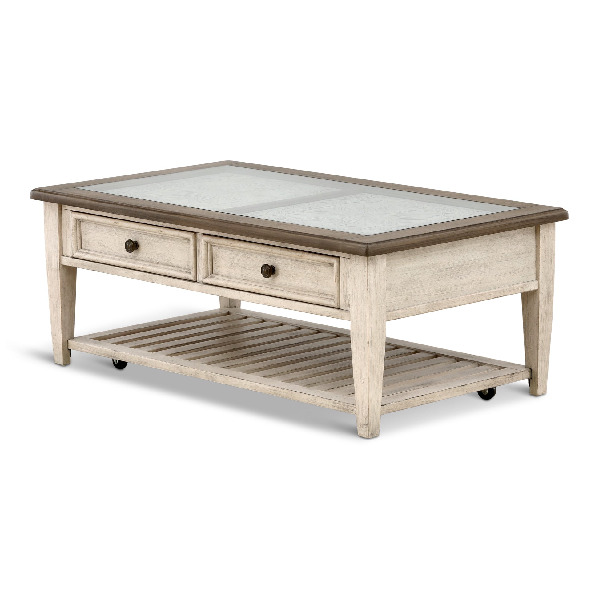 The Killian coffee table is designed to inspire with its antique white finish and cathedral white oak framed top, focusing all your attention through the beveled glass onto the tin ceiling tile centerpiece. The coffee table also features an open slat display shelf and hidden casters for easy mobility.