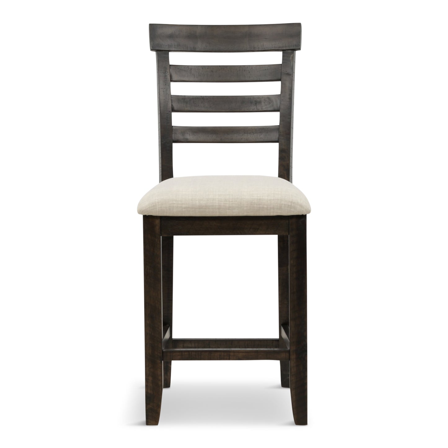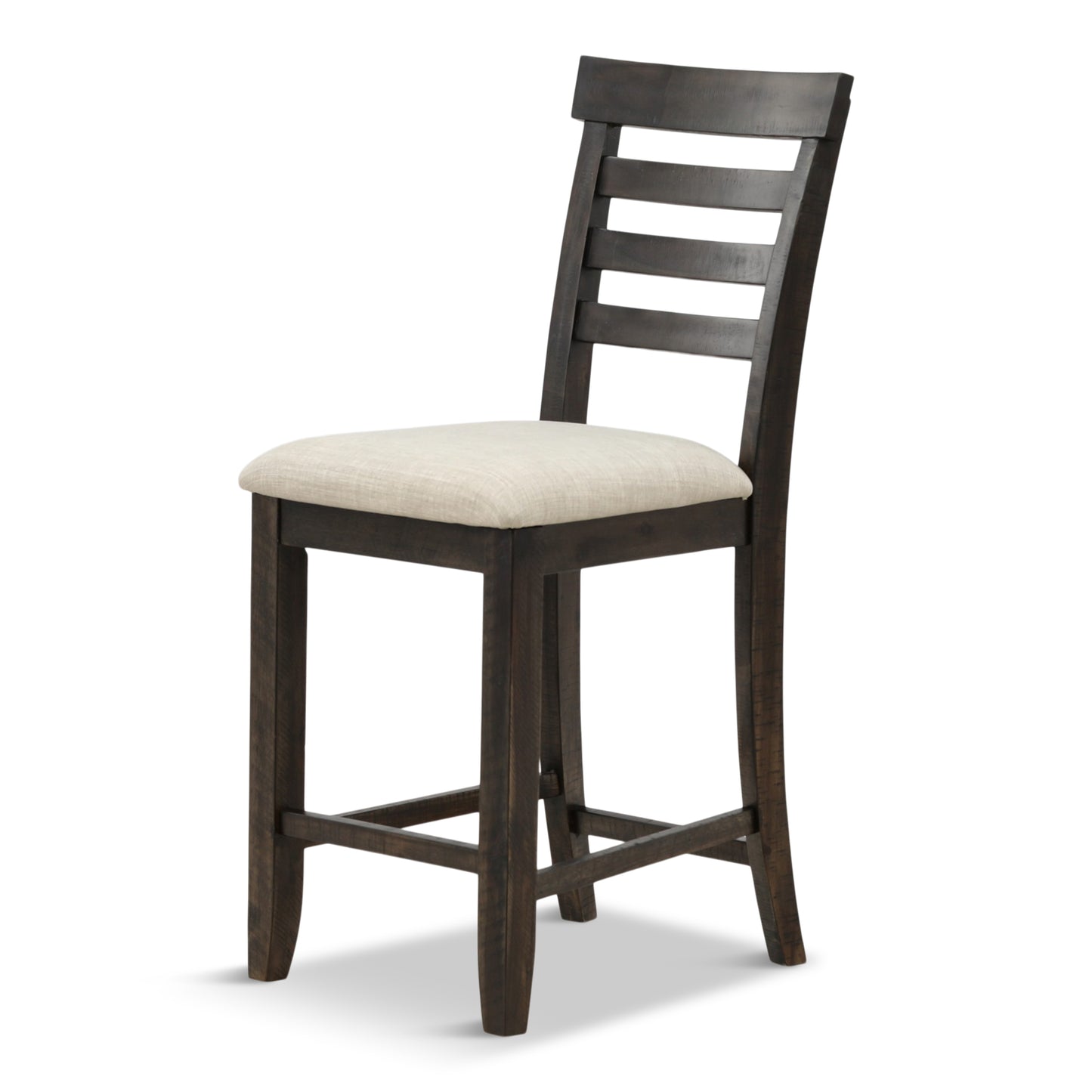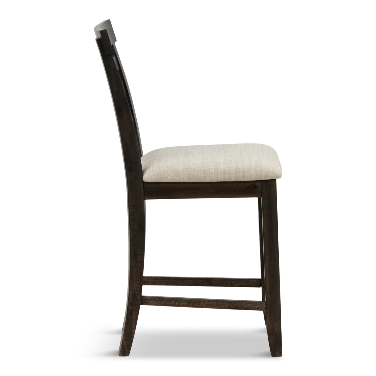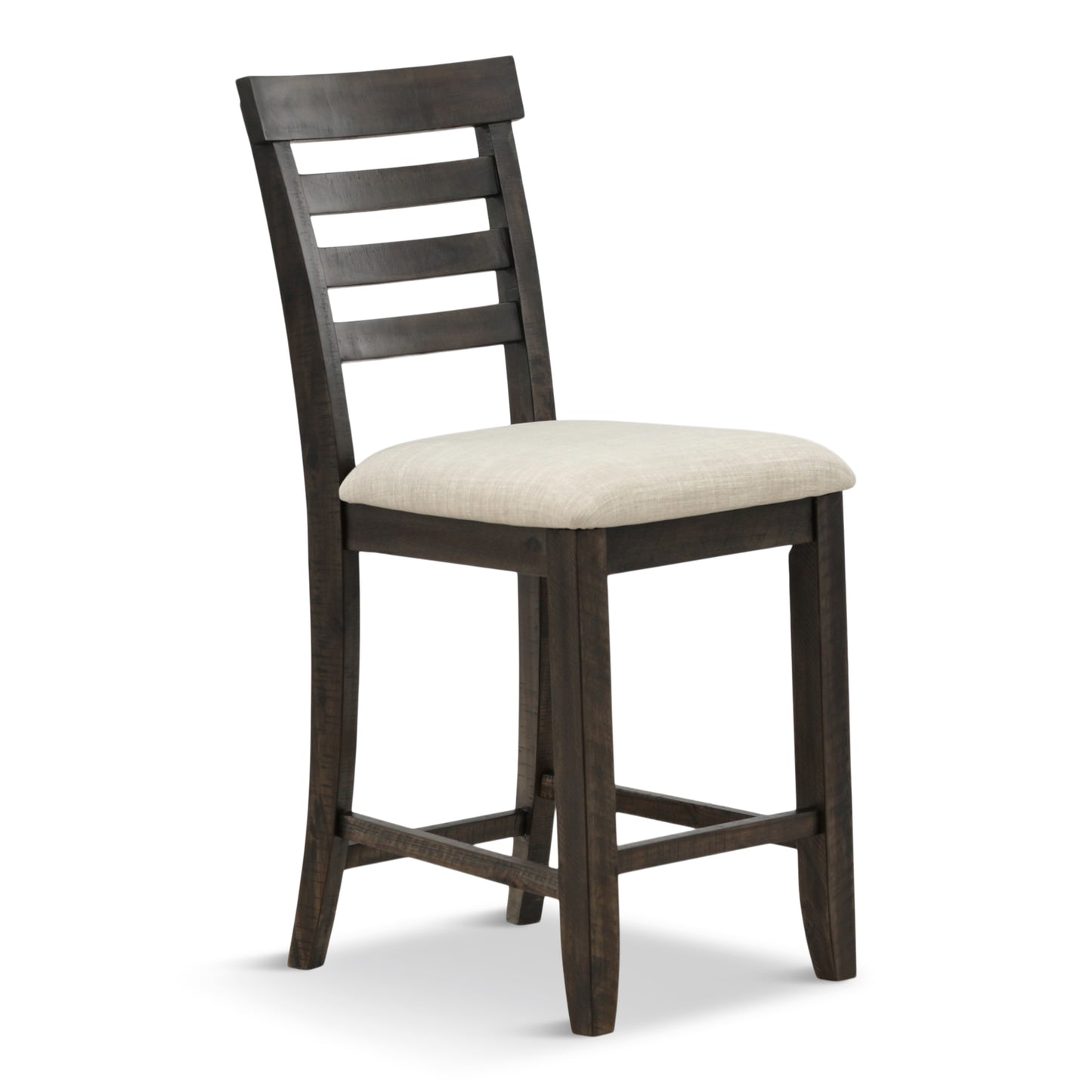 The Solomon counter height dining collection, brings boldness to a casual dining scheme. With a trestle base design and a deep finish, this everyday counter height table serves as a perfect gathering space. Enjoy an attractive chevron design on its table top while accommodating deep chairs and extra storage. The inventive table design creates options for positioning to suit your needs. The slat back design of the chair and the black hardware finishes, reflect a design-forward blend of modern and farmhouse concept.