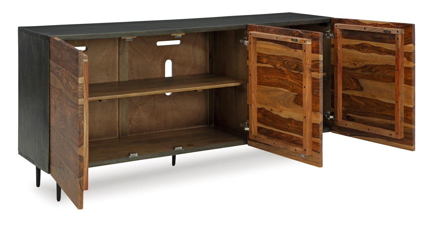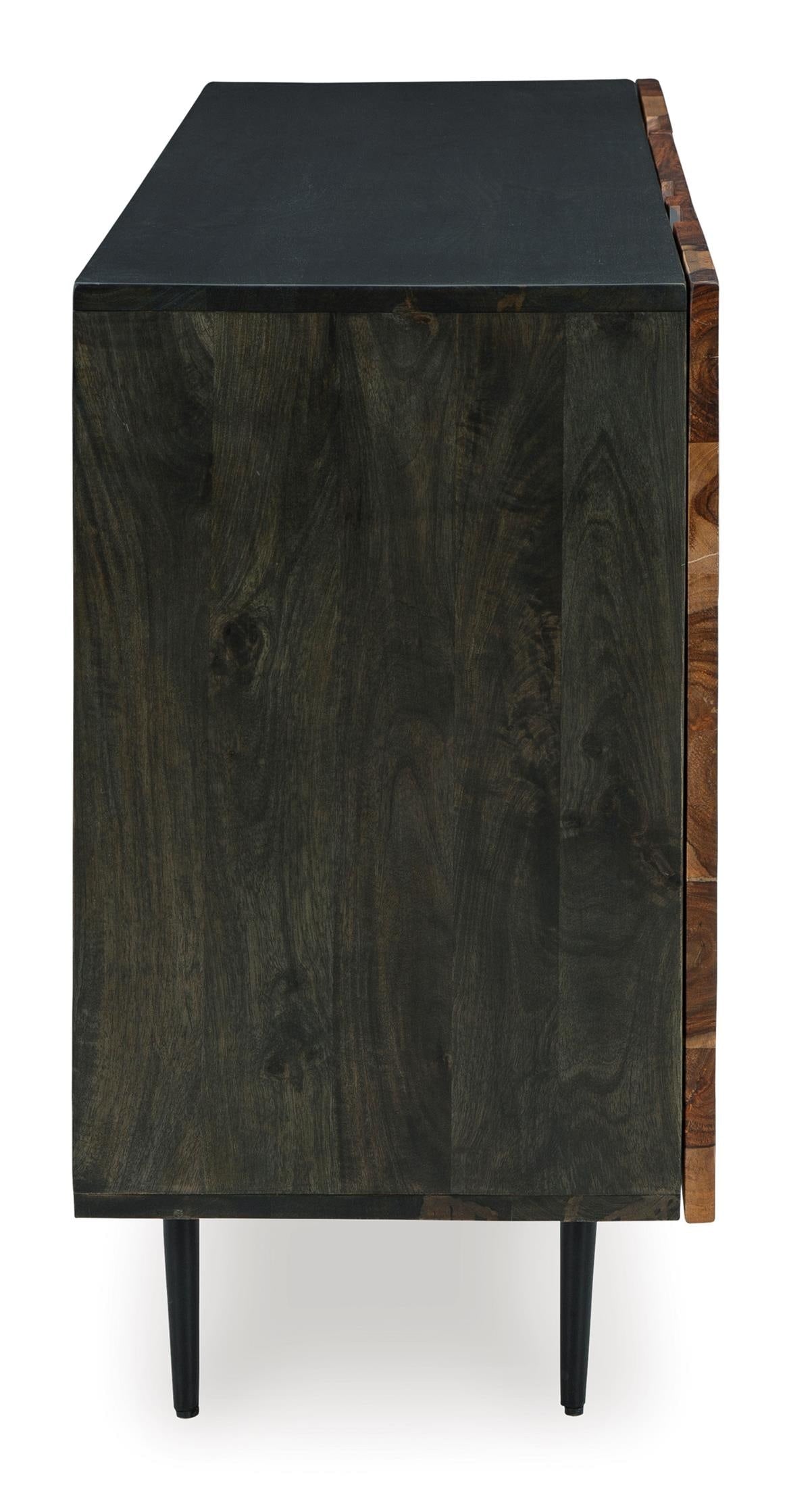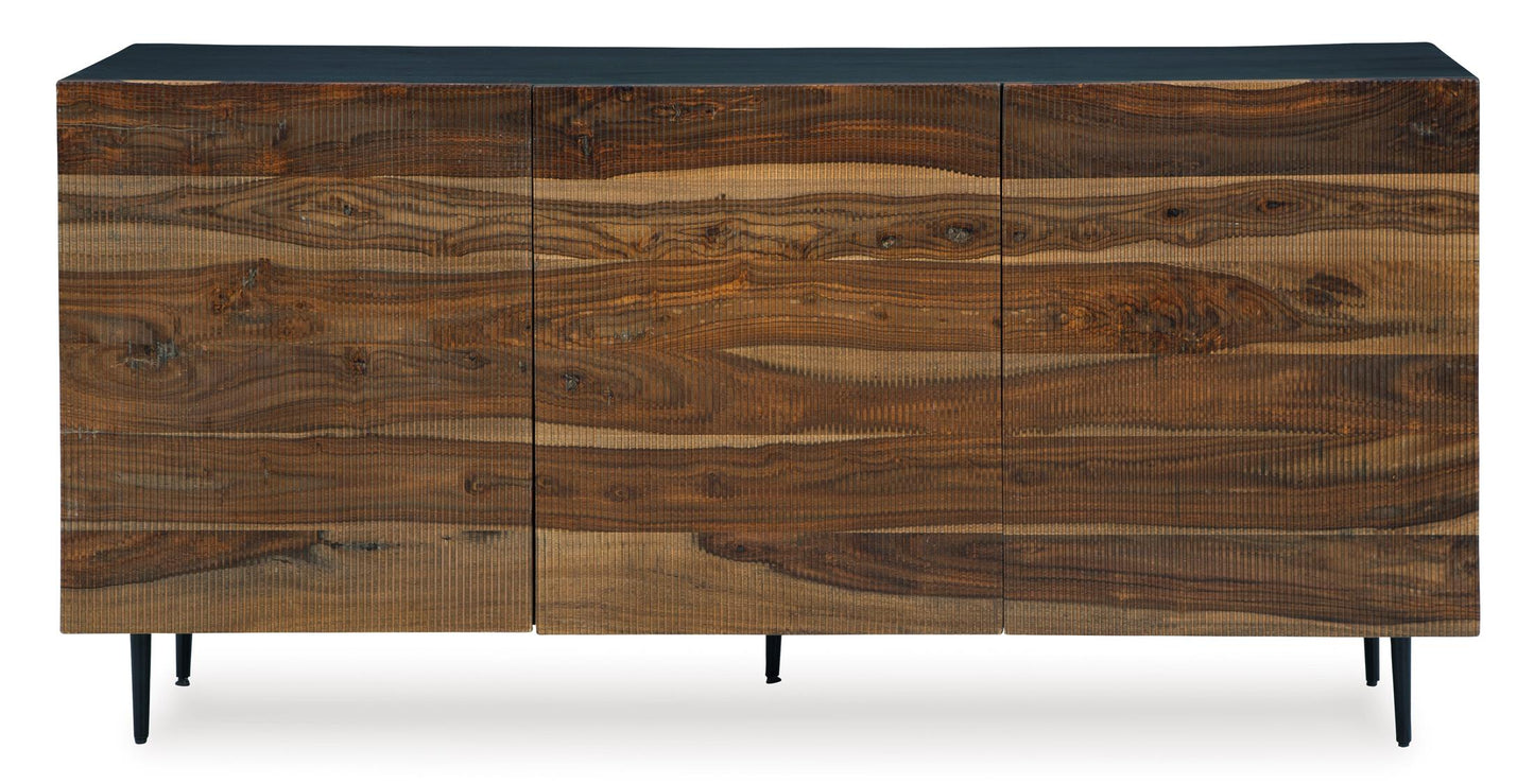This mid-century modern inspired piece is skillfully crafted with durable solid mango and shesham wood. The natural and deep brown finish in addition to the fluted, grooved door fronts provide character anywhere it’s displayed. Pair it with sumptuous velvet upholstery and accents in a brushed brass-tone finish for an exquisite look.