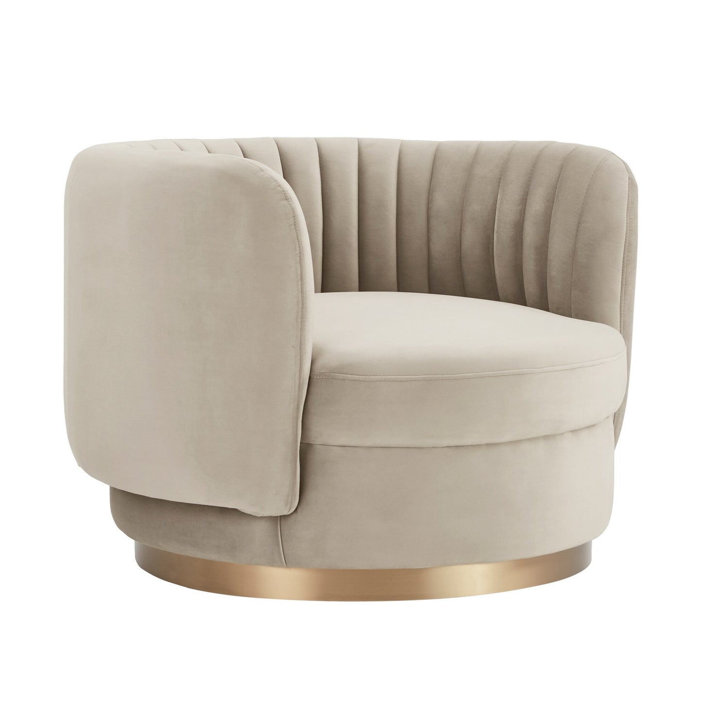 The Davy Tufted Velvet Swivel Chair from Armen Living is such a visually appealing piece that has practical elements to make this the best chair for your home. The rounded chair back encapsulates your body to make you feel comfortable and secure. The foam-padded seat cushion is plump and soft, making this your new favorite chair in the house to relax in. The Davy has a very special feature that brings a swivel function to this already fantastically designed chair; swivel in a full 360-degree motion for maximum mobility. The rich velvet upholstery is elegantly combined with the thick gold brushed base to create an overall eye-catching addition to your home. The Davy is available in your color choice of Blush, Dark Gray, and Taupe.