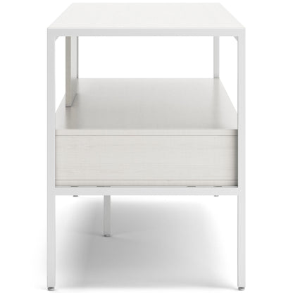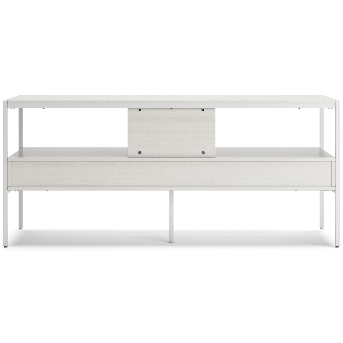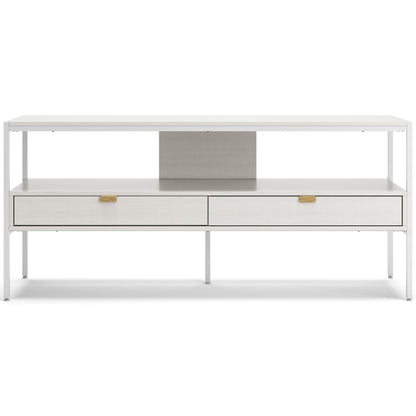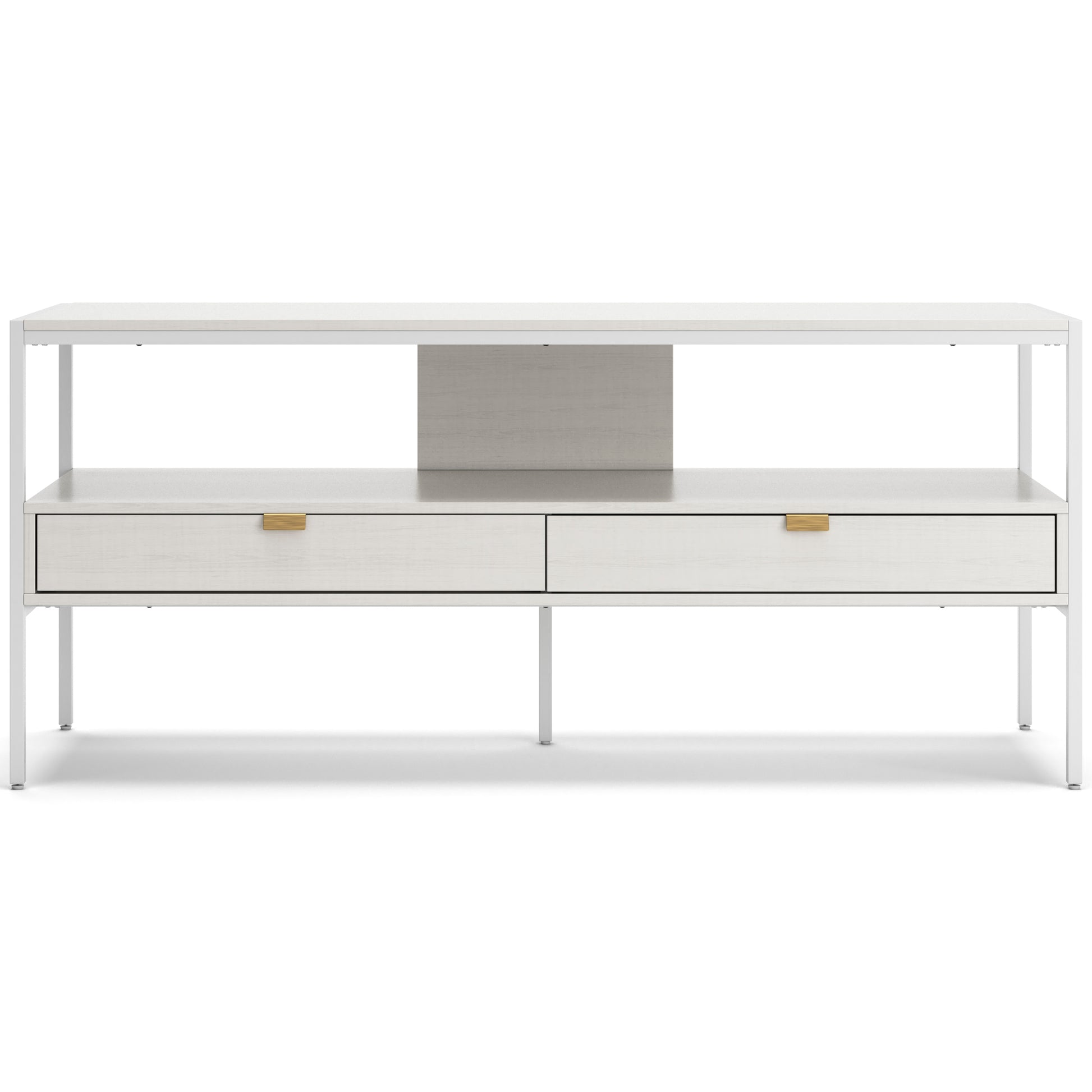 Bring your vision of a modern living room to life with this sleekly designed TV stand. Its linear construction and white finish keep things minimal. An open shelf and two drawers allow you to store in simply streamlined style, rounding out this versatile, striking piece.