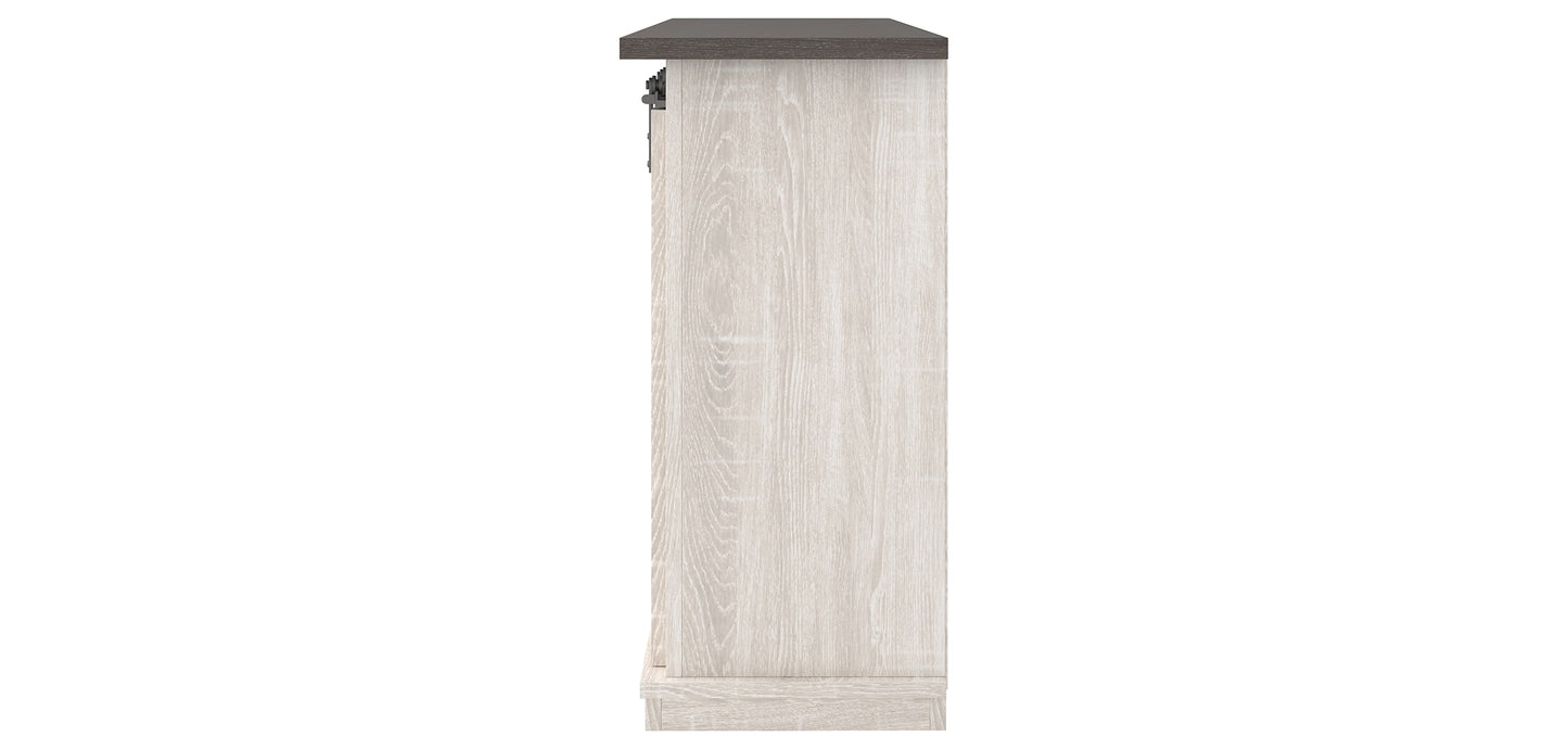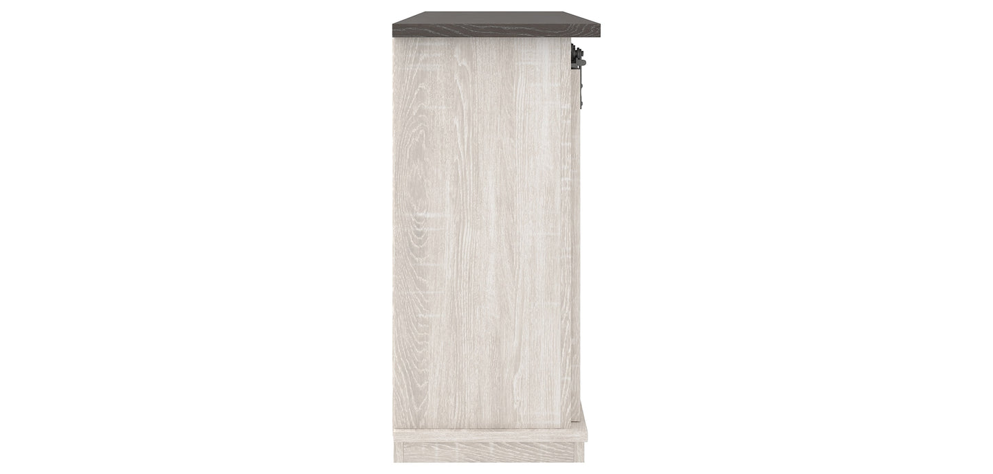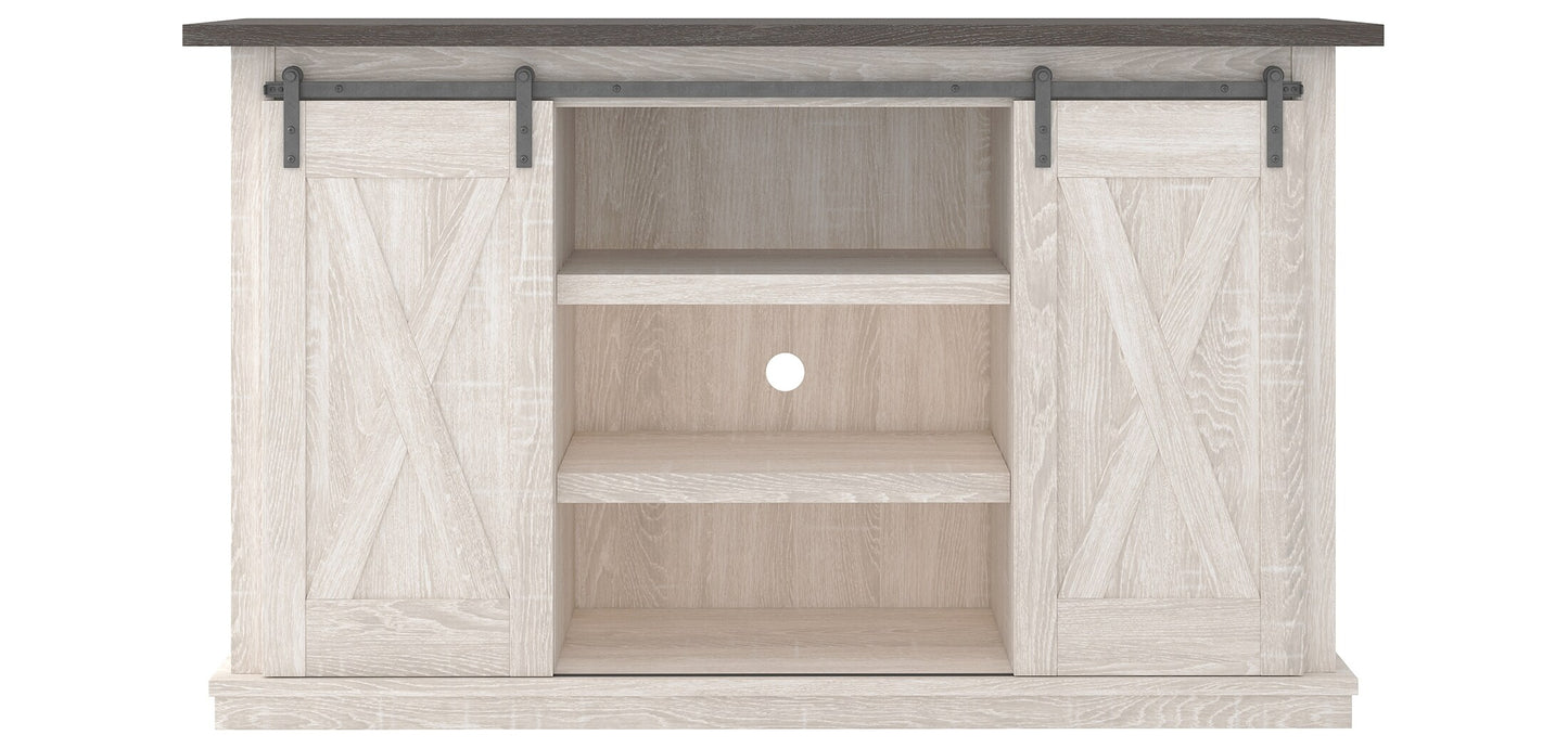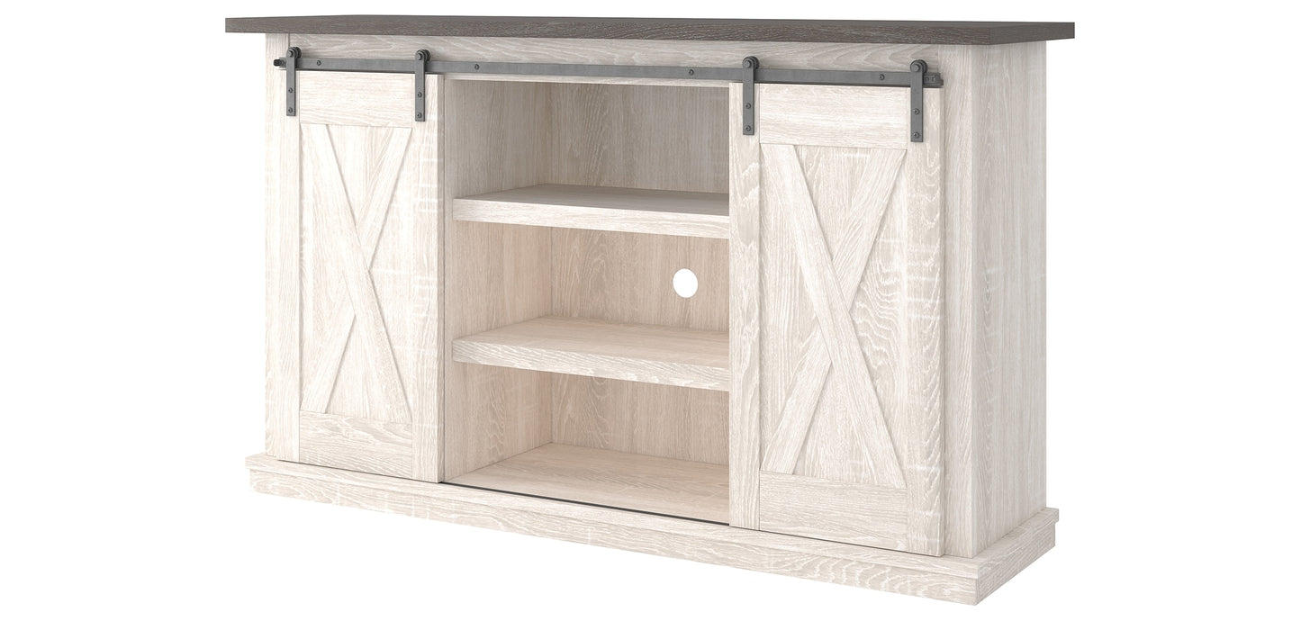 With its two-tone finish, cross-buck details and authentic charm, the Dorrinson TV stand is right in tune with your relaxed approach to high style. Beautifully made to accommodate your media equipment, it’s well equipped with adjustable shelving, cutouts for wire management and, of course, a pair of sliding barn doors you can center or place to the side. What a mastery in modern farmhouse living.