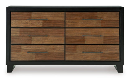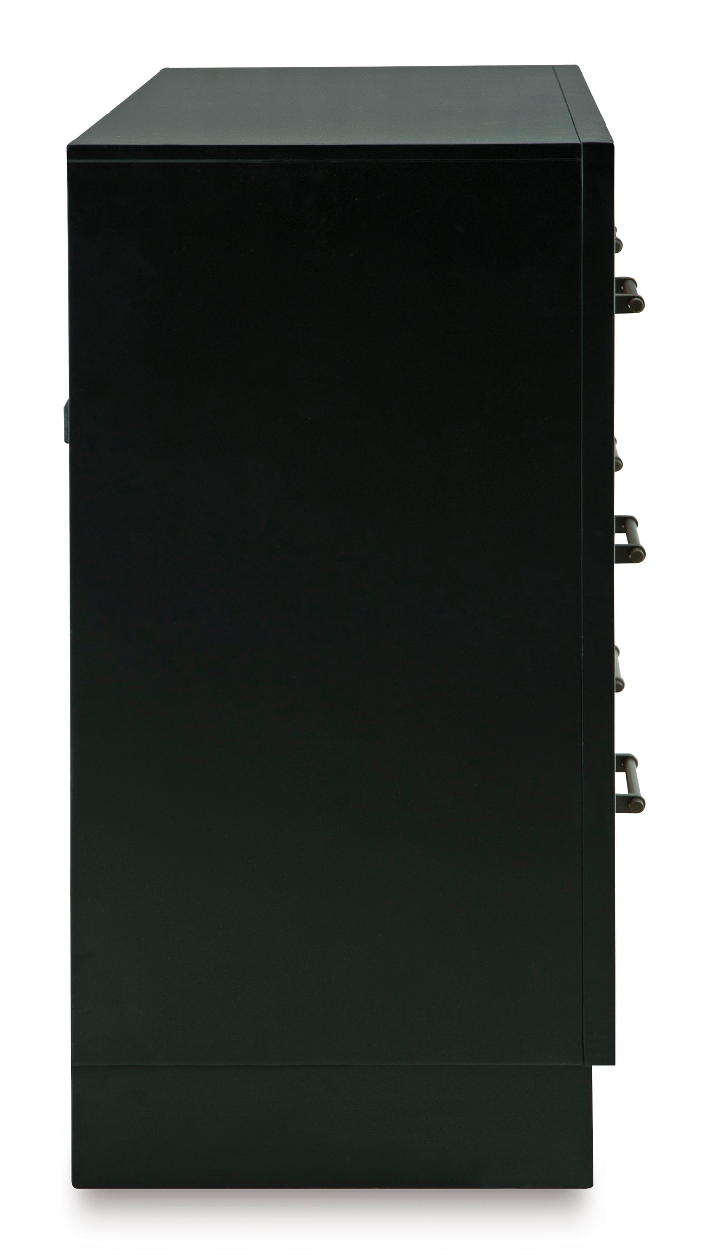 Experience the captivating allure of this dresser, an effortless blend of casual and refined aesthetics. Its two-tone finish combines satin black with a rich brown wood tone for a modern, relaxed vibe that you'll love waking up to. Perfectly suited for your contemporary home, this dresser has plenty of drawer space to tuck away your wardrobe and spare bed linens.