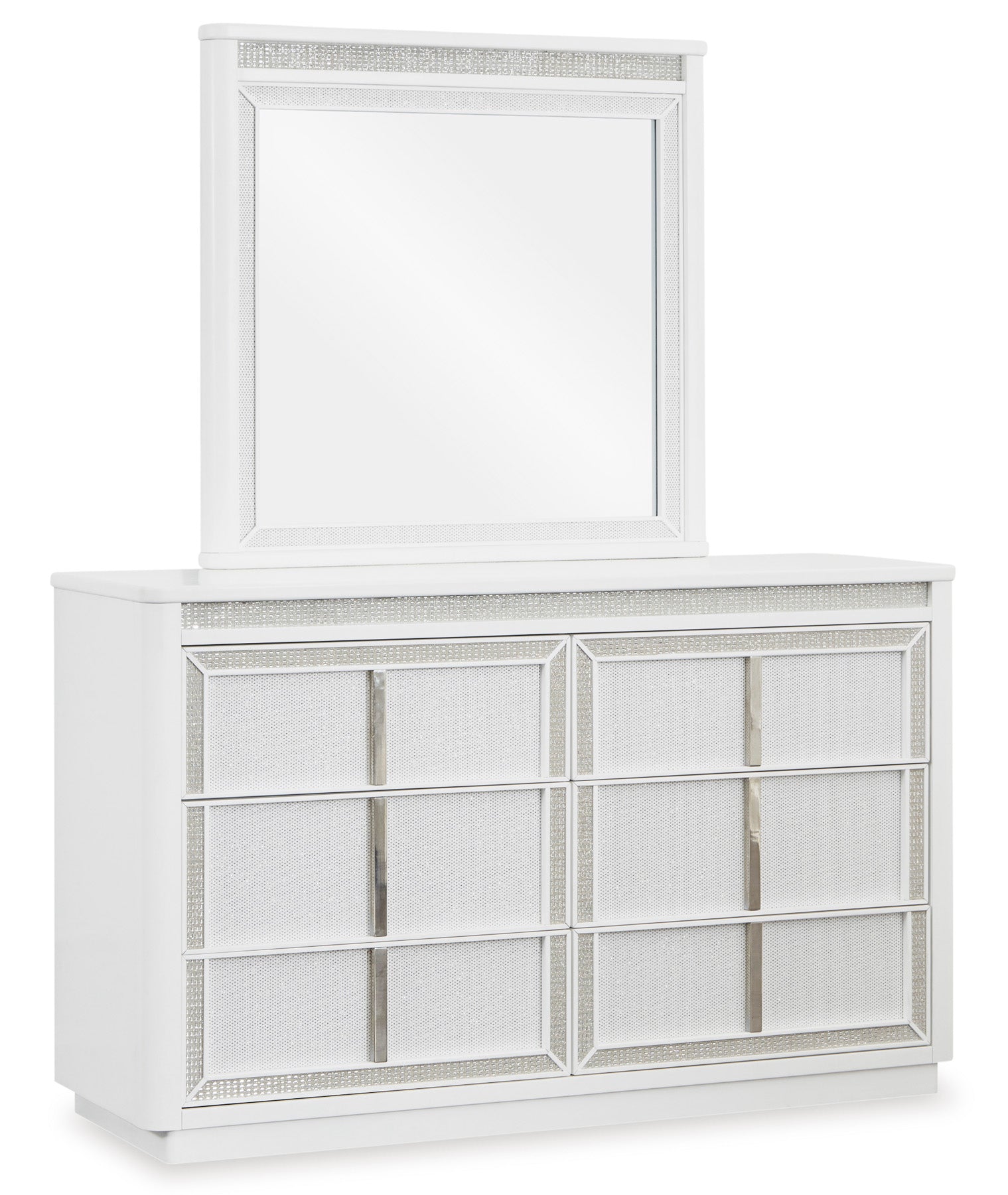 Transform your bedroom with the Chalanna dresser and mirror. Its modern design and glamorous details create a sophisticated retreat. The built-in LED lighting and rhinestone-framed drawers add style and practical storage. Let your sanctuary shine—and never let anyone dull your sparkle.