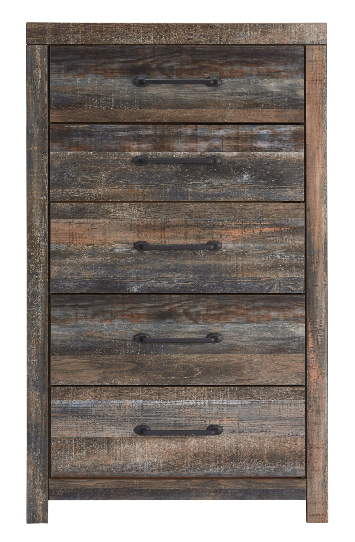 When merged in just the right way, rustic and industrial styles can make one happy marriage. Case in point: this bedroom chest. A refined take on barn board beauty, its complex, replicated wood grain showcases hints of burnt orange and teal tones for a sense of weatherworn authenticity. Elongated drawer pulls elevate the aesthetic.