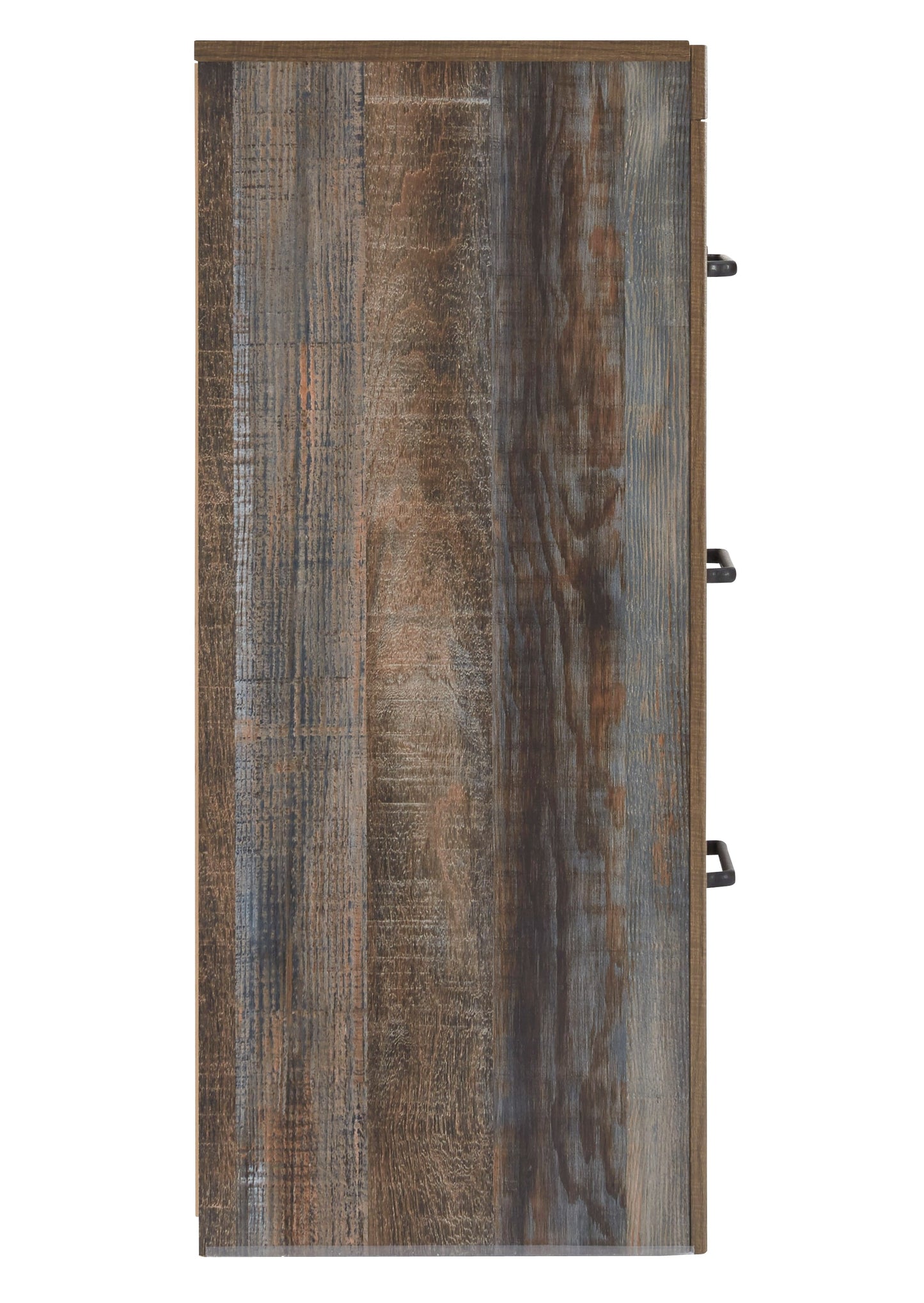 When merged in just the right way, rustic and industrial styles can make one happy marriage. Case in point: the Drystan dresser. A refined take on barn board beauty, its complex, replicated wood grain showcases hints of burnt orange and teal tones for a sense of weatherworn authenticity. Elongated drawer pulls elevate the aesthetic.