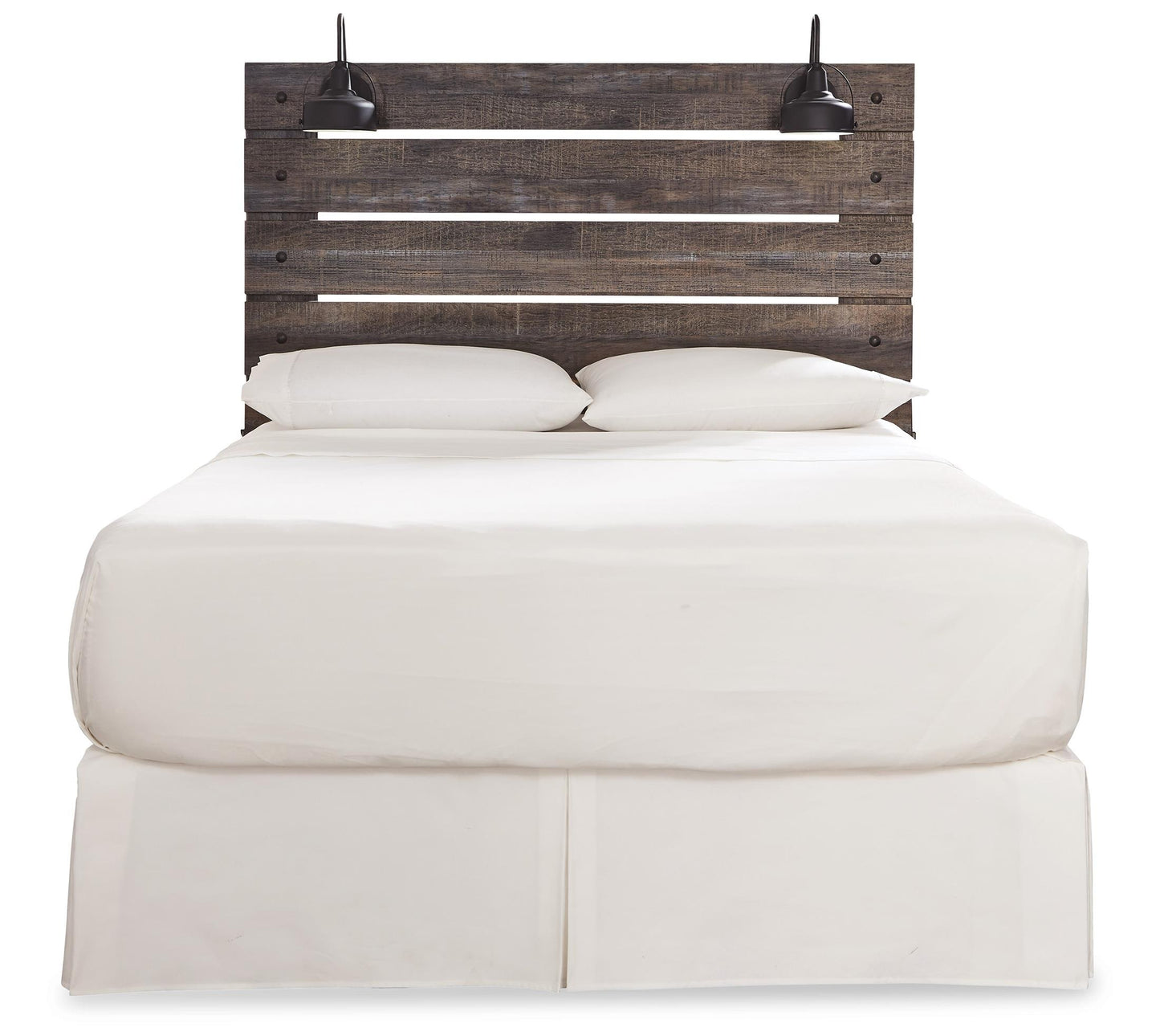 When merged in just the right way, rustic and industrial styles can make one happy marriage. Case in point: the Drystan queen panel headboard. A refined take on barn board beauty, its complex, replicated wood grain showcases hints of burnt orange and teal tones for a sense of weatherworn authenticity. Love to read in bed? You’re sure to find the pair of retro-chic light sconces and USB plug-ins on the open-slat style headboard such a bright idea.