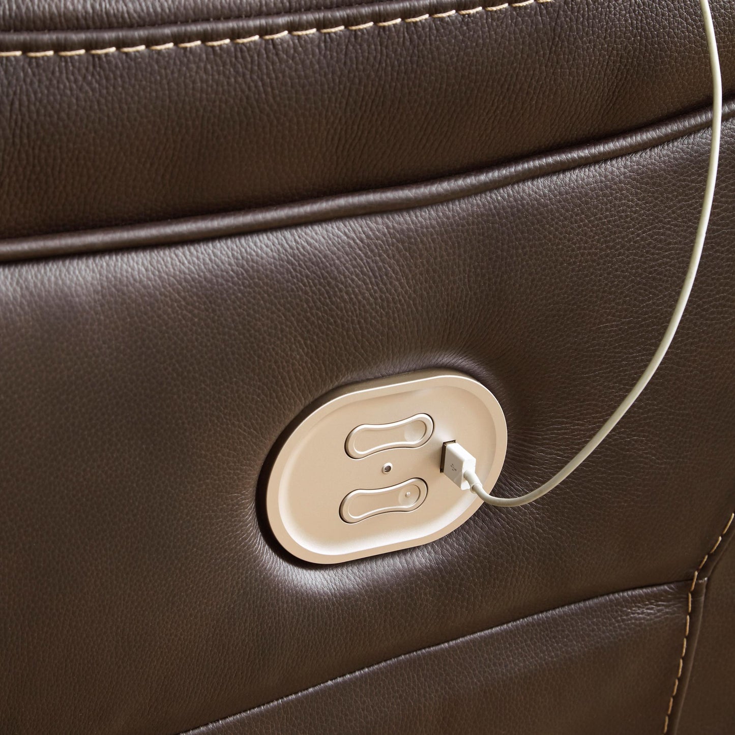 Load up on comfort in a cool, clean-lined and contemporary way with this power reclining sectional in chocolate brown. Rest assured, the leather match upholstery is enriched with a pebble grain effect for authentic appeal and enhanced with jumbo stitching for dramatic contrast. It features a one-touch power control with adjustable positions, along with an Easy View™ adjustable headrest that allows a primo view of the TV even when you're reclined. Extended ottomans provide extra length for leg comfort. A zero-draw USB plug-in at your fingertips lets you charge up as you chill out.