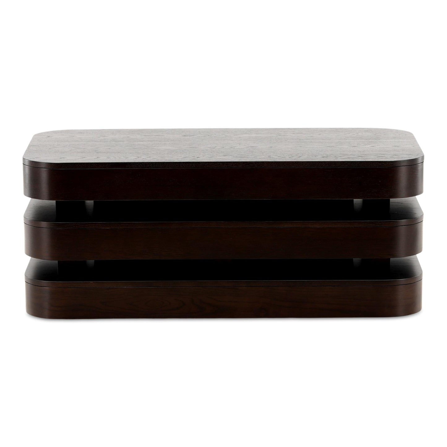 The Elvio occasional collection features cantered bases and softened edges. Combines mobility with cohesive design. It’s substantial tiered shelves provide ample storage and depth.