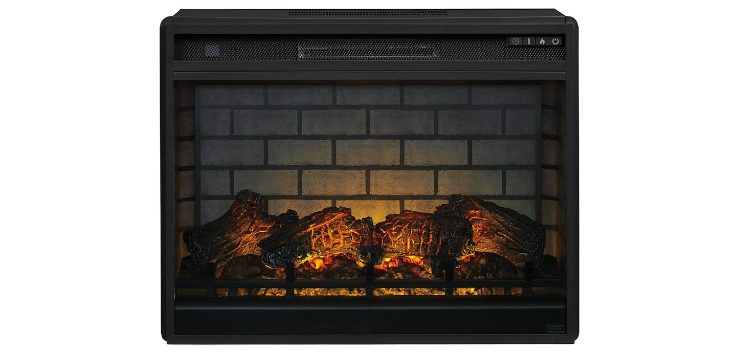 Enjoy the cozy feel of a cracklin’ fireplace without the hassle, maintenance or cleanup. Available as an addition on select TV stands and entertainment centers, this fireplace insert with faux firebrick surround operates with or without infrared heat and includes a multi flame feature, 7-level temperature setting, five brightness levels and LED glowing embers effect.