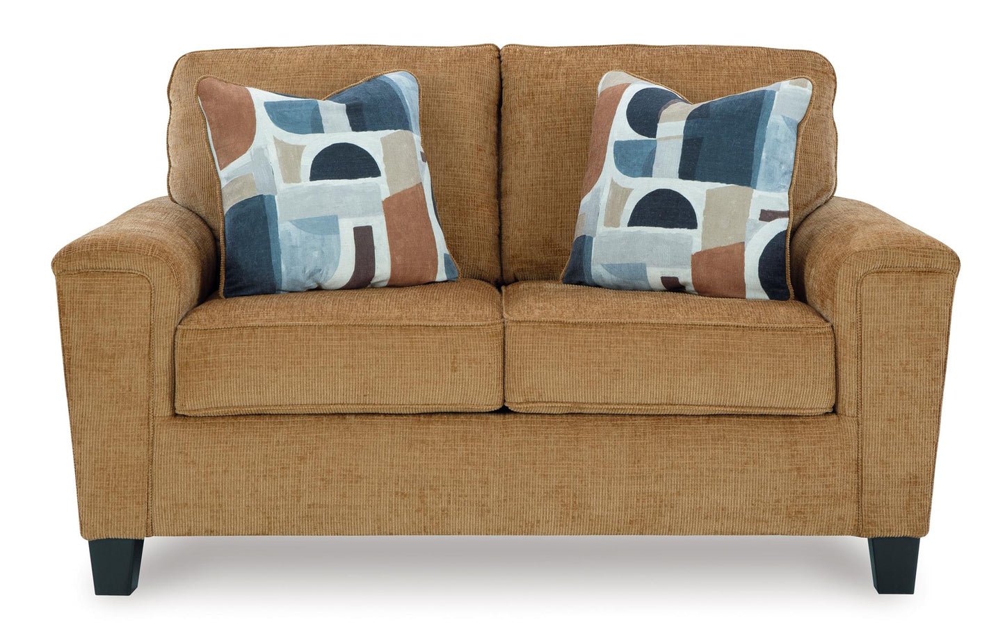 There’s something about this loveseat that’s so easy to appreciate. Maybe it’s the plush upholstery and soothing tone, eager to support your quest for total relaxation. Perhaps it's the modern flair of its simple lines, tapered legs and abstract-patterned pillows. Whatever it is that appeals to you, this is a piece you're gonna love.