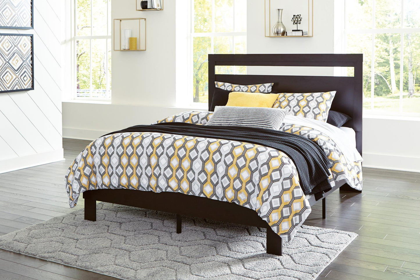 If you’re a fan of clean, crisp and contemporary interiors, rest assured the Finch queen panel headboard suits you. Its linear profile is enhanced with a matte black finish with subtle replicated wood grain. The headboard's peekaboo cutout adds a cut-above element. Hard to believe such a high-style aesthetic can be so attractively priced.