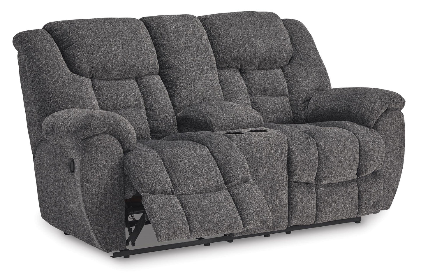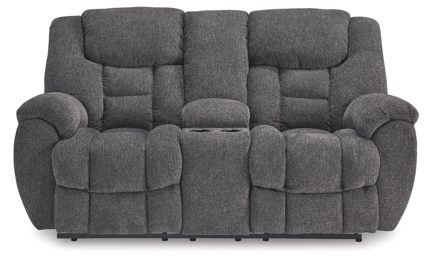 Sometimes seeing is believing. And you can rest assured that this reclining loveseat with console is every bit as indulgent as it looks. Designed to put you in the lap of luxury, the generously scaled seating—wrapped in a wonderfully plush and practical charcoal gray Next-Gen Nuvella™ upholstery—sports pillow-wrapped armrests and curvaceously cushioned head-neck support for feel-good flair.