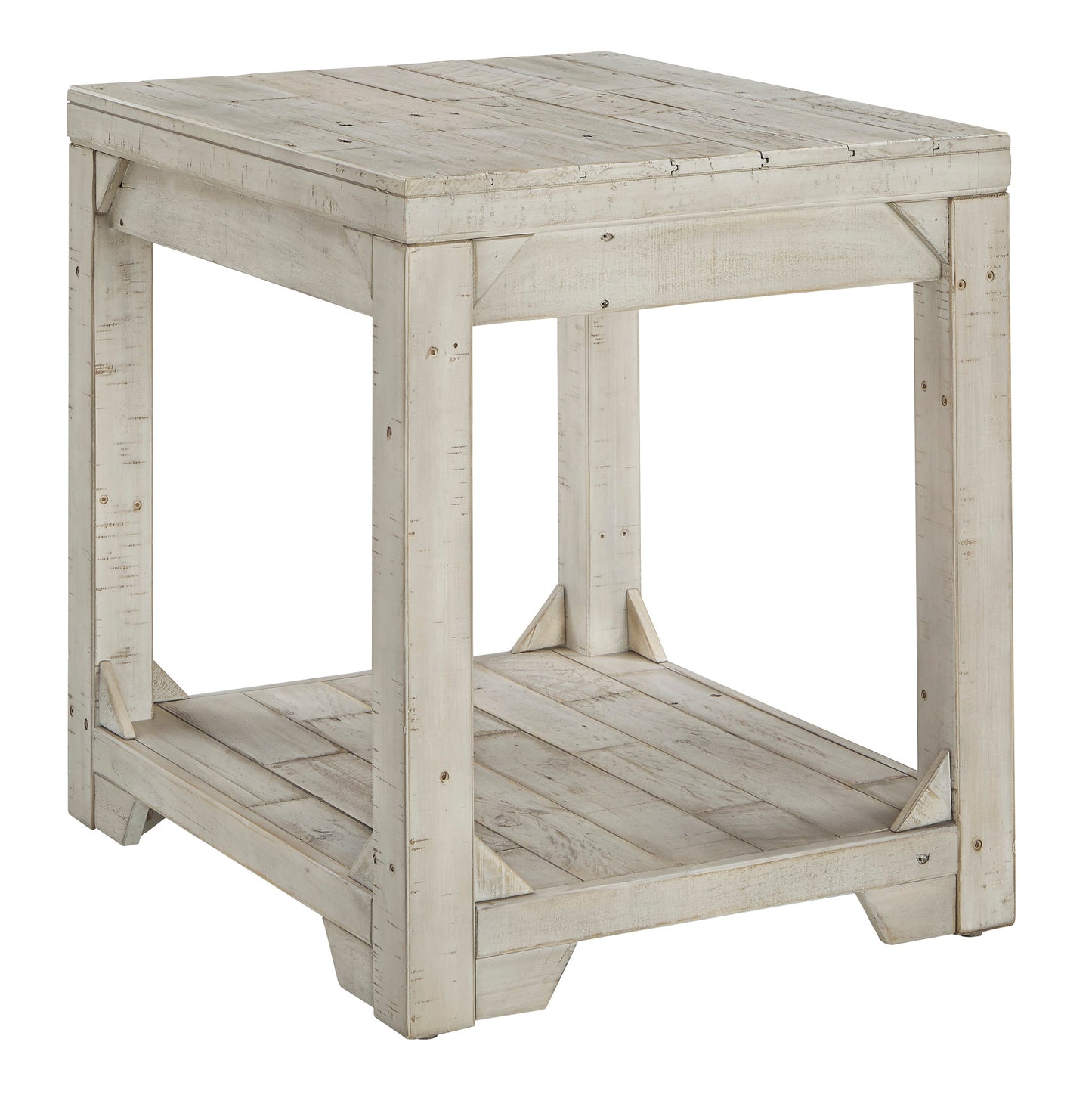 Take in the country fresh look of the Fregine end table and connect with a simpler time. Its farmhouse style is evident in its stocky design with planked top/bottom shelf, unique triangle accents and relaxed white washed finish. With a handcrafted look, you'll love the casual feel this piece brings to your living area.